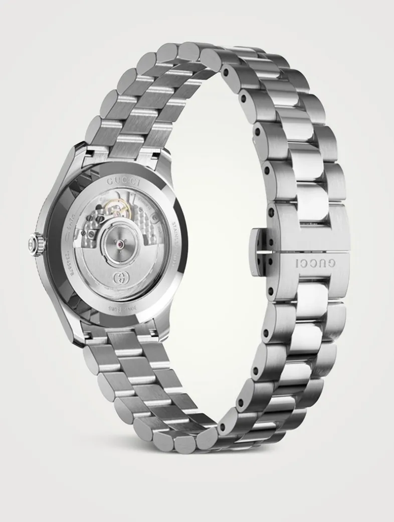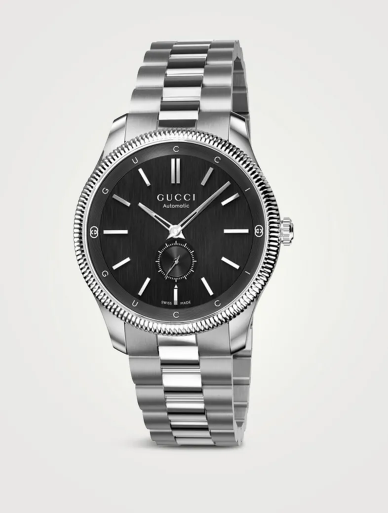 The round shape of this watch spotlights a sleek black dial with subtle expressions of the Interlocking G, Gucci lettering, and signature motifs. Finished with a steel bracelet, the accessory is enriched with a small seconds display.