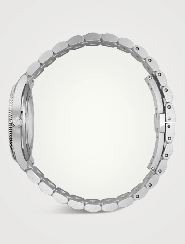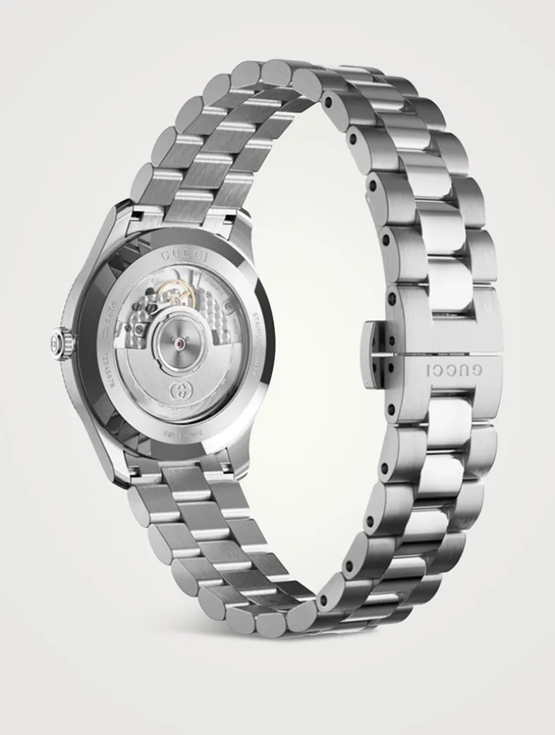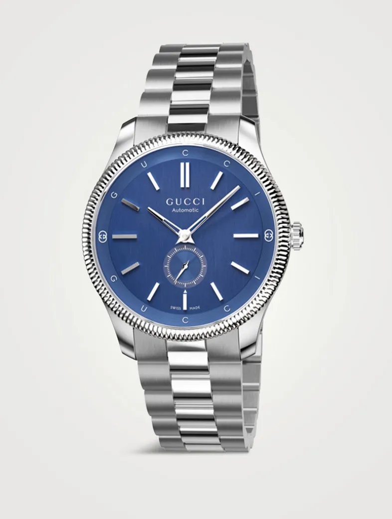 The round shape of this watch spotlights a sleek blue dial with subtle expressions of the Interlocking G, Gucci lettering, and signature motifs. Finished with a steel bracelet, the accessory is enriched with a small seconds display.