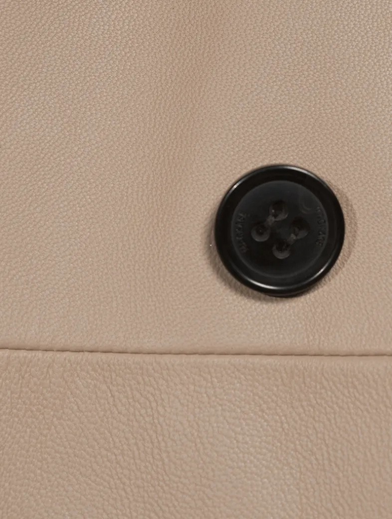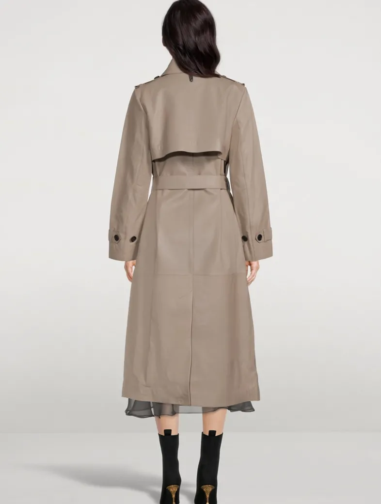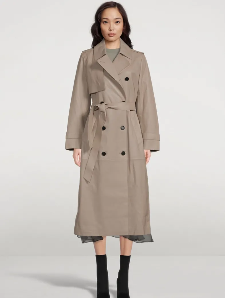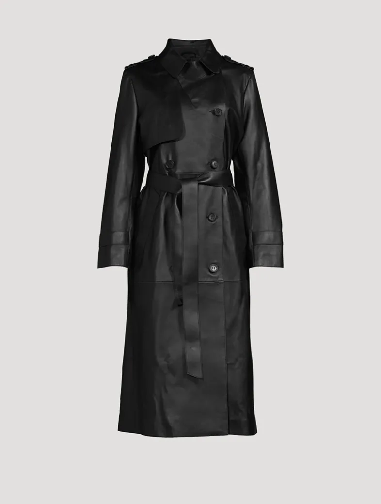 Gael is a double-breasted trench coat crafted from buttery leather. The wide notched Napoleon lapel and asymmetrical rainshed bring confident lines. The long relaxed silhouette is structured by a removable belt and adjustable strap cuffs. Welt waist pockets, epaulette shoulders, and painted edges show elevated tailoring. A timeless piece with standout style, perfect for layering through the year.