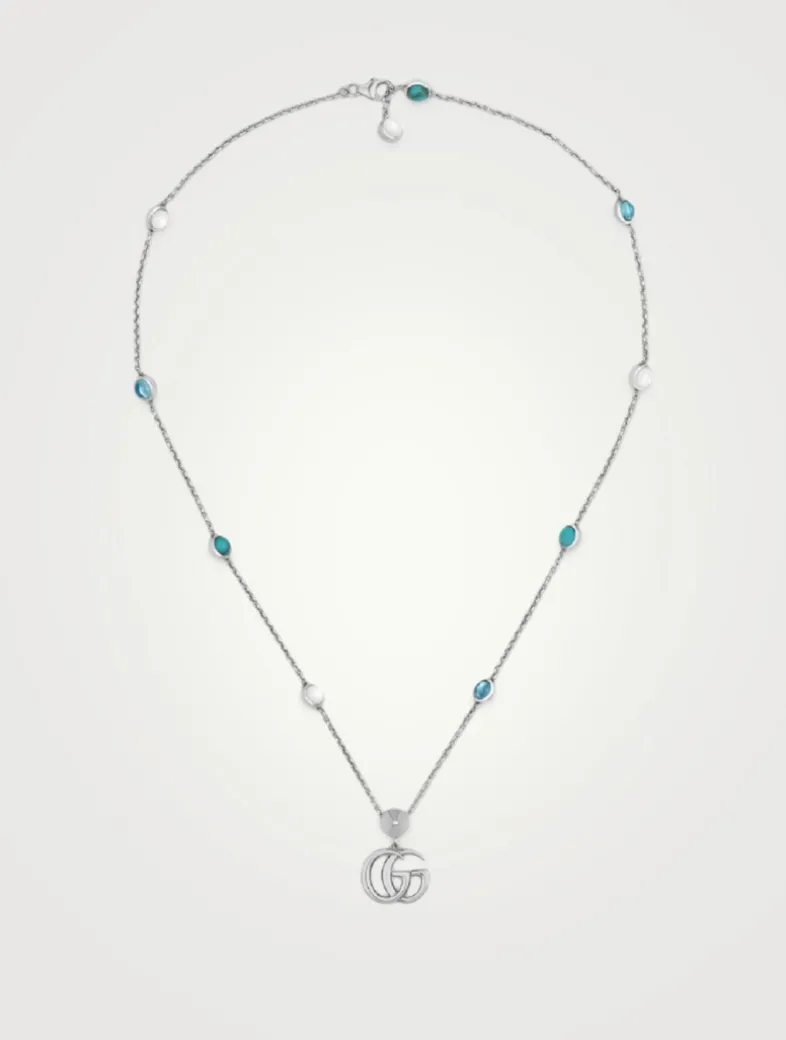 Featuring the signature Double G emblem in shiny aged sterling silver, this necklace is stationed with mother-of-pearl, blue topaz and turquoise resin. Hypoallergenic and nickel-free. In line with the brand’s sustainability strategy, GUCCI guarantees, internally and within its supply chain, respect for standards of Social & Environmental Responsibility. GUCCI gold, platinum and diamonds are certified by the Responsible Jewellery Council whose mission is to promote responsible, ethical, social and environmental practices that guarantee human rights throughout the gold and diamond supply chain, from mines to retail.