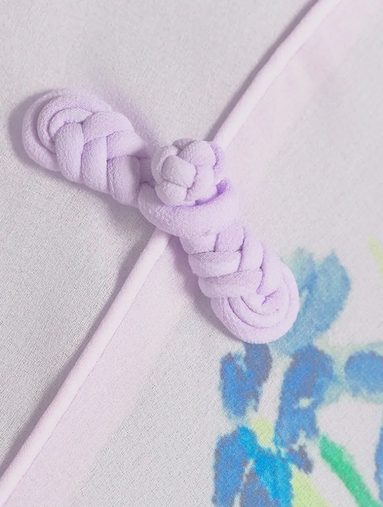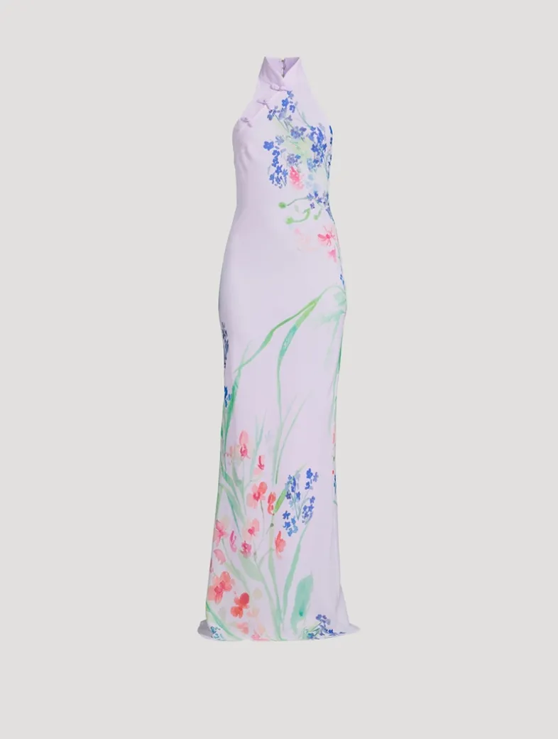 Cut to a backless halter silhouette, this chiffon Cheongsam dress is designed with a bias-cut maxi skirt and a high collar featuring SAU LEE’s signature hand-tied pipa knot button detail.