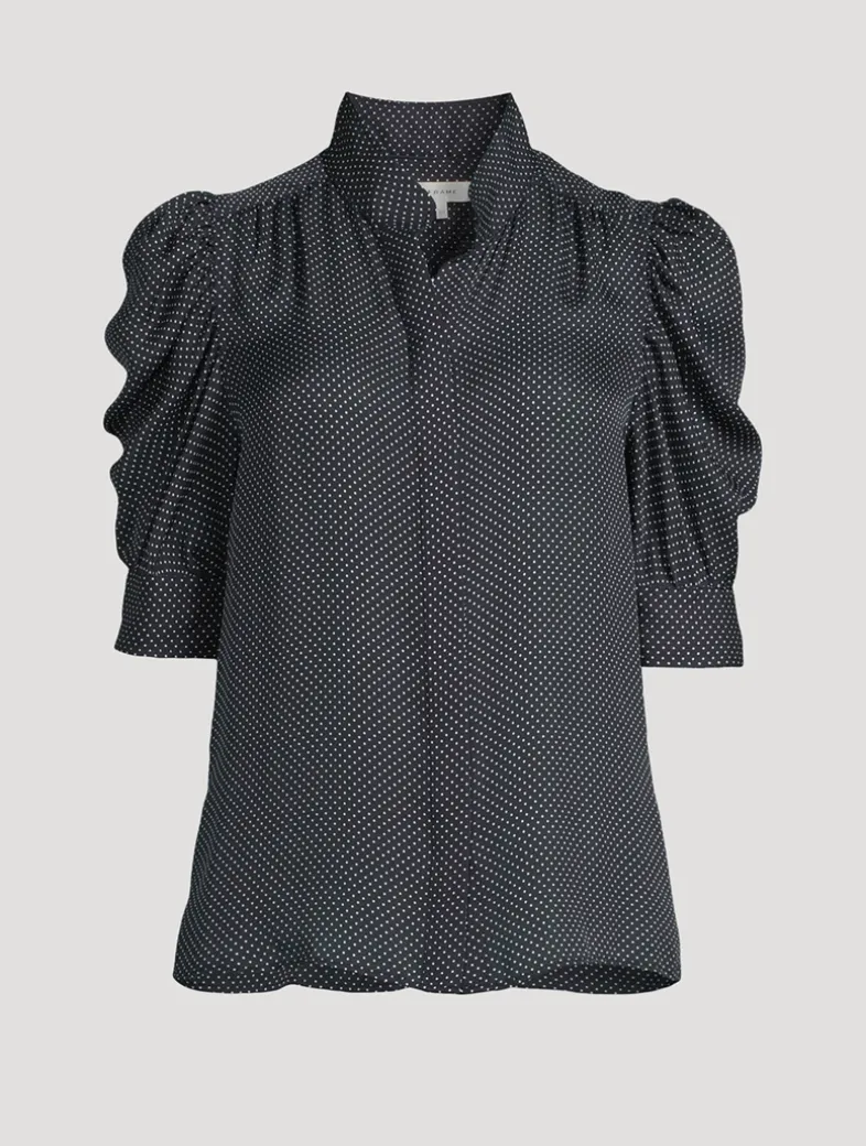 At once modern and romantic, this silk blouse features a high neckline and boldly puffed sleeves with ruched detailing.