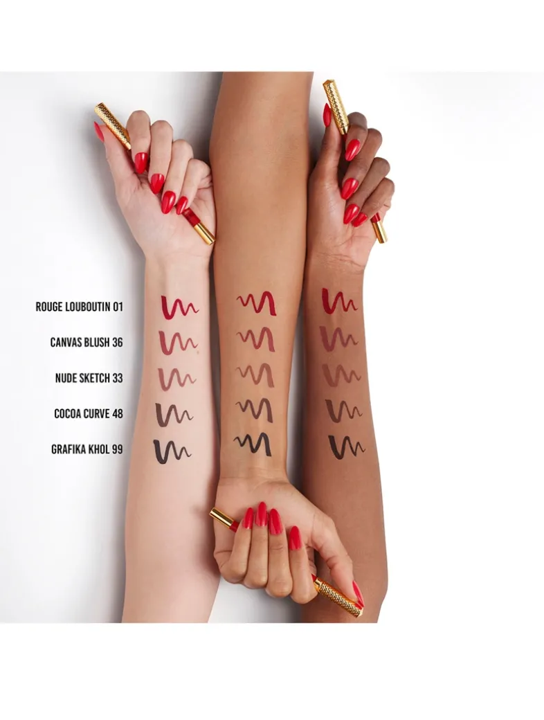 Glamliner has an ultra-pigmented and precise liner that glides on eyes and lips smoothly and brings coverage without drying or smudging to blend and build. Its formula is no-transfer and waterproof. Five shades from the lightest to the darkest Nude sketch, Cocoa Curve, Grafika Khol, to the iconic Rouge Louboutin and Canvas Blush in between. More than just a liner, Glamliner invites you to redraw the lines and redefine shape as your lips speak volumes – and your eyes define.