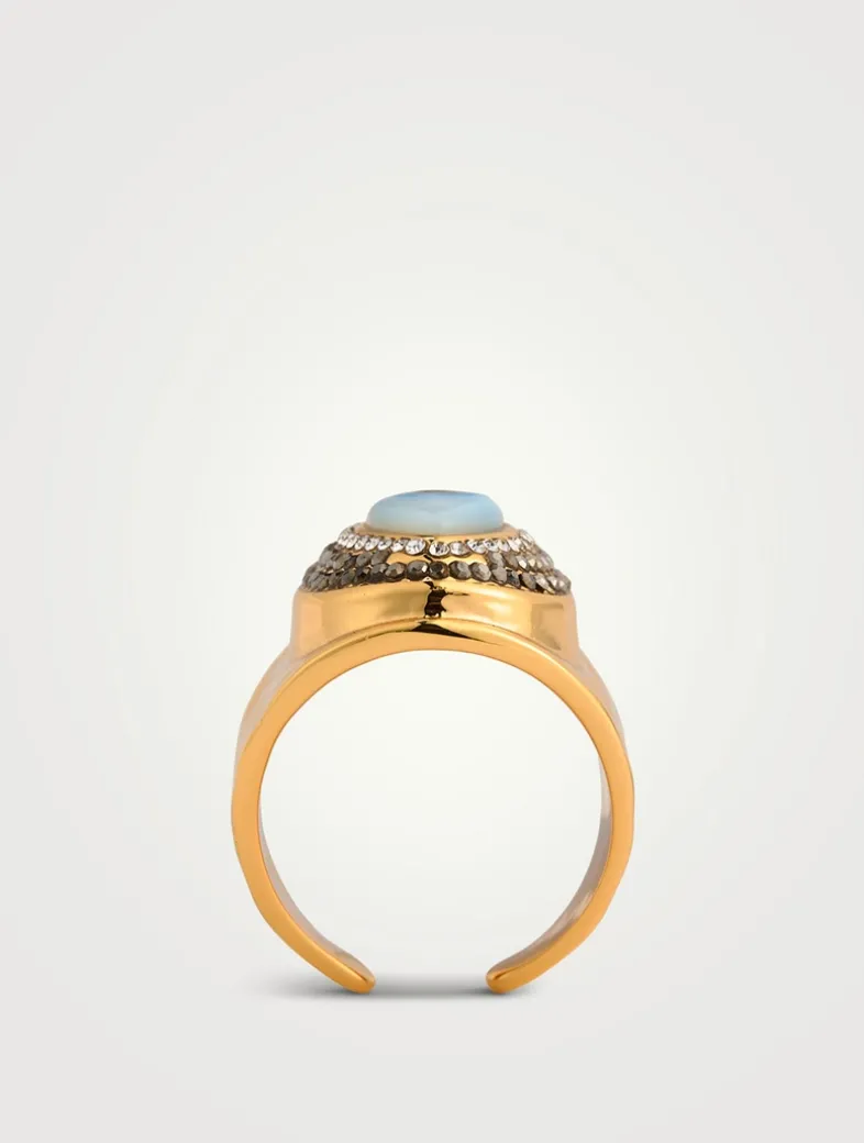 This bold evil eye ring is framed with sparkling pavé stones. The evil eye is said to have a watchful gaze that is believed to keep its wearers safe from jealousy and harm, and help with karma and fate protection. They are also believed to open the flow of communication.