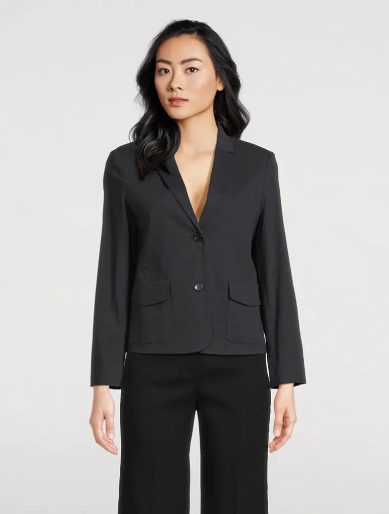 Defined by its shrunken slim fit, this tailored blazer features notched lapels, side patch pockets, and a two-button closure. Crafted from Theory’s signature stretch Good Linen fabric, this single-breasted style is an everyday favourite. Woven by the Marini & Cecconi Mill in Prato, Italy, Good Linen is a signature stretch linen fabric, made up of three fibers— flax sourced from France, viscose made from repurposed cotton fiber waste, and certified recycled elastane for stretch.