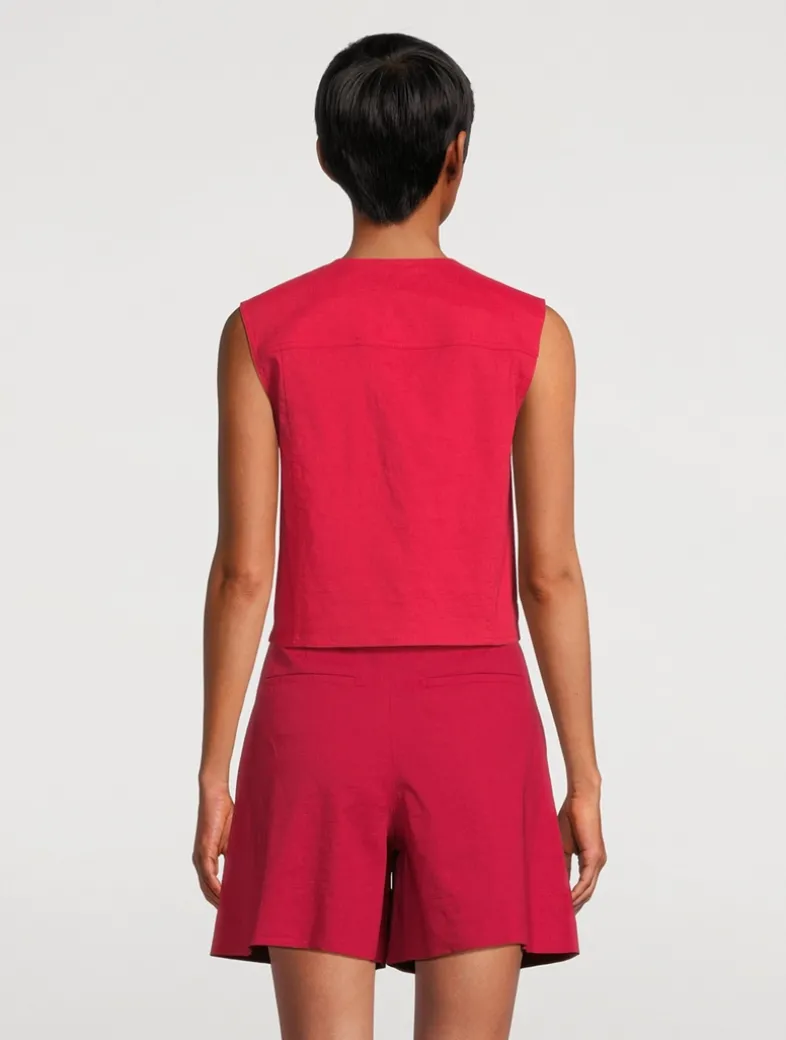 Worn as a top on its own or an outside layer, this vest is tailored for a relaxed silhouette with a round neckline and flap pockets. The single-breasted, button-front design is crafted from Theory’s signature stretch Good Linen fabric. Woven by the Marini & Cecconi Mill in Prato, Italy, Good Linen is made up of three fibers—flax sourced from France, viscose made from repurposed waste cotton fibers, and recycled elastane for stretch.