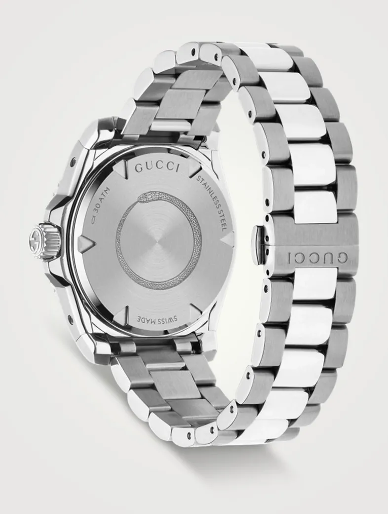 Marked by its diver’s watch inspired design, here the Gucci Dive appears with a silver dial with bee and a steel bracelet. Taking inspiration from the archives, the latest collection reimagines emblematic codes with a contemporary spirit.