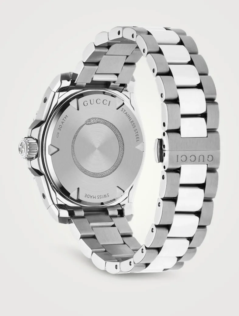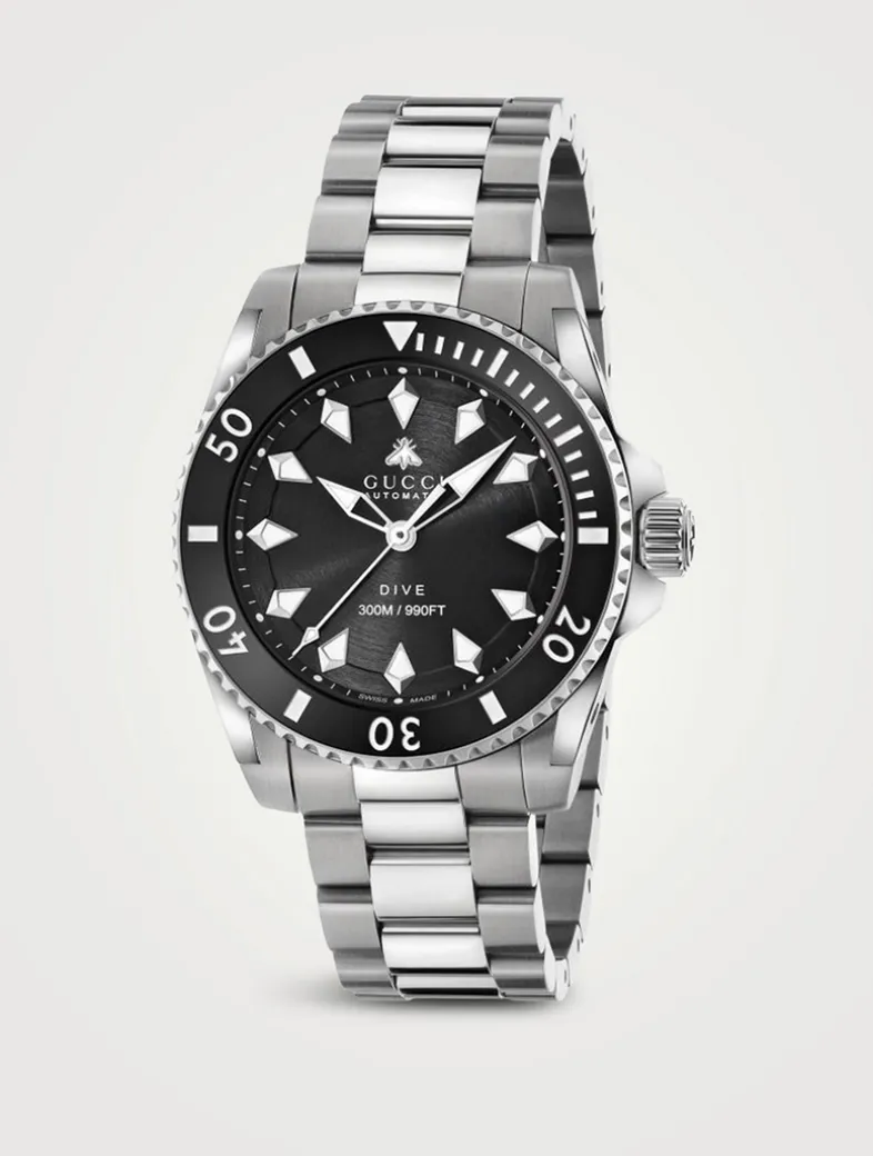 Marked by its diver’s watch inspired design, here the Gucci Dive appears with a black dial with bee and a steel bracelet. Taking inspiration from the archives, the latest collection reimagines emblematic codes with a contemporary spirit.