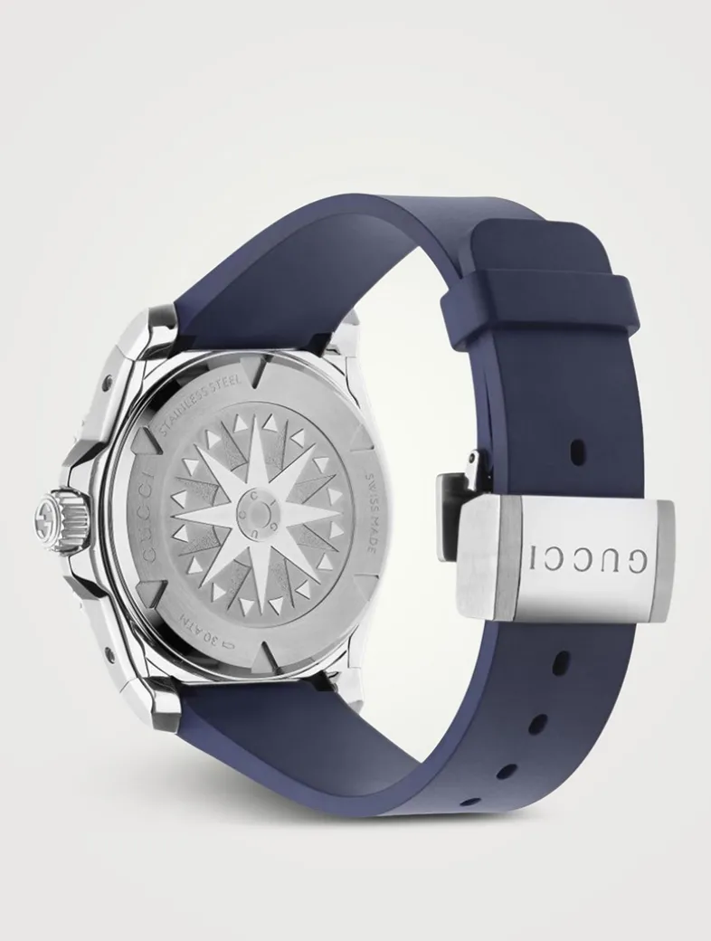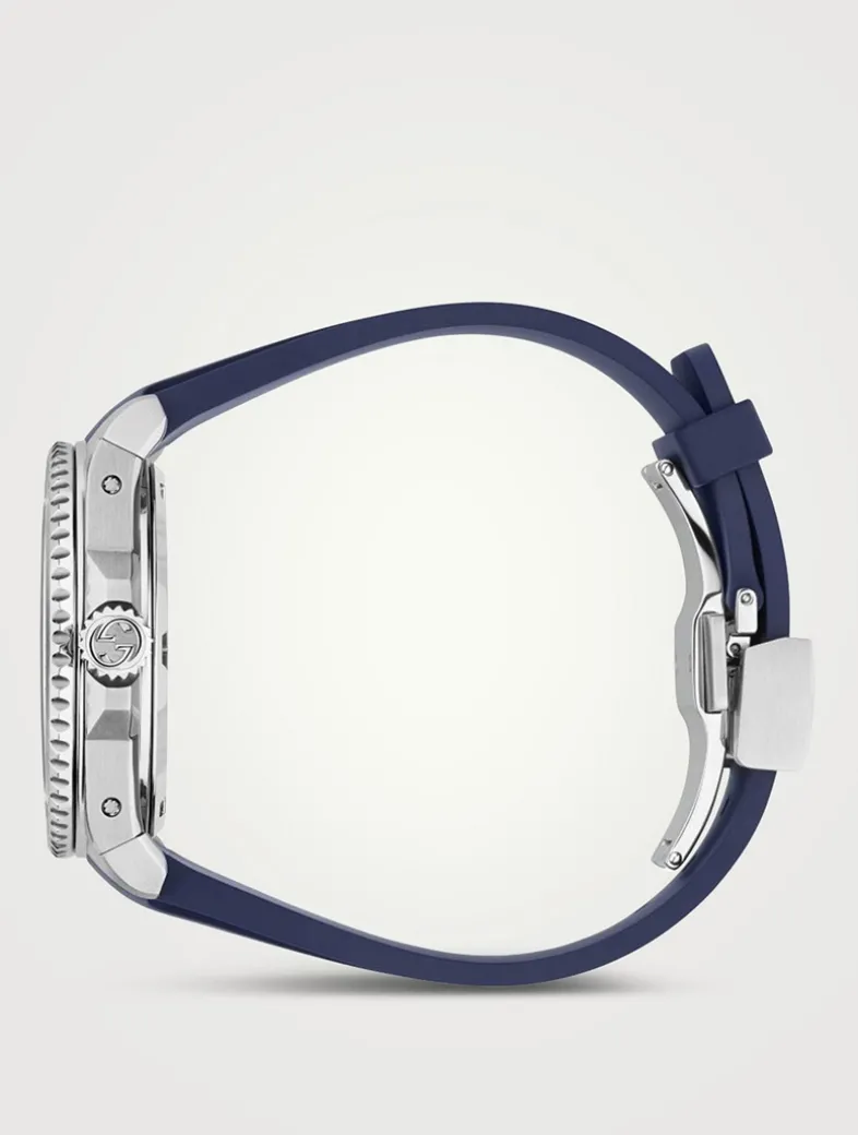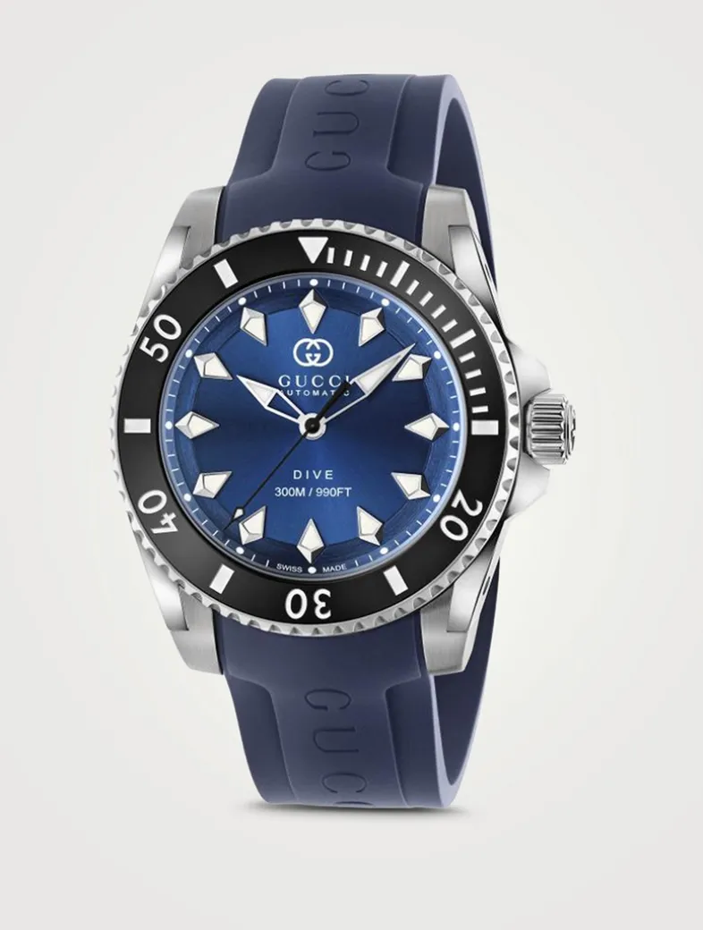 The Gucci Dive line continues to explore the House codes in contemporary ways. Designed with a steel case and a rubber strap, this watch features a blue dial and ceramic bezel. A automatic movement powers the piece.