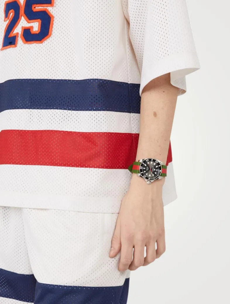 A new introduction to the Dive family, the watch combines the House symbolic elements: the Web stripe and the Gucci bee. Designed with a steel case and a ceramic bezel, the accessory is defined by a black dial featuring the emblematic bee motif. A red and green rubber Web strap completes the style.