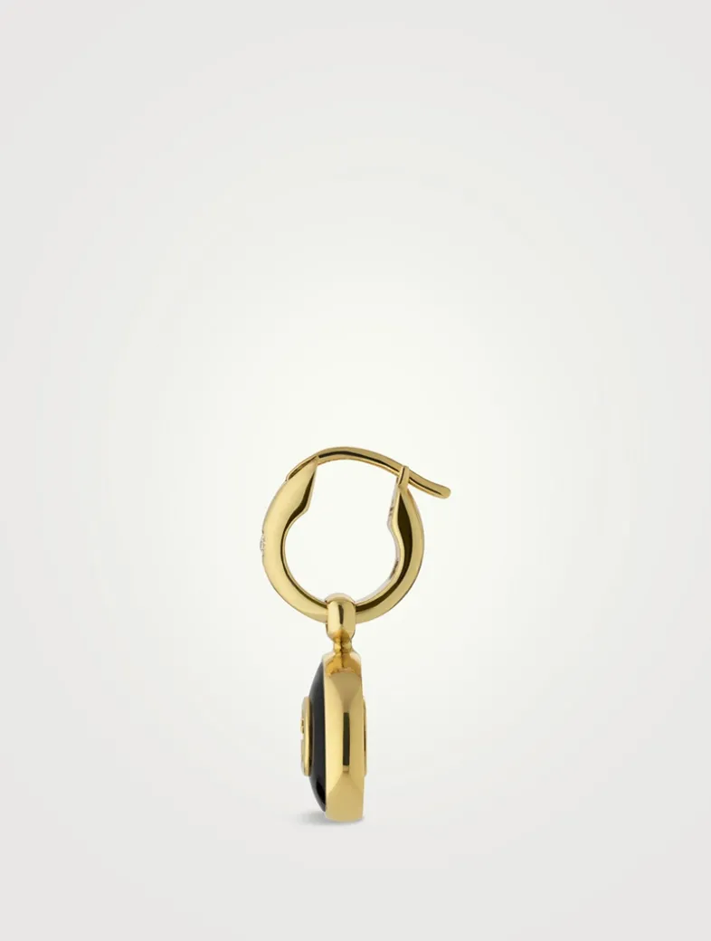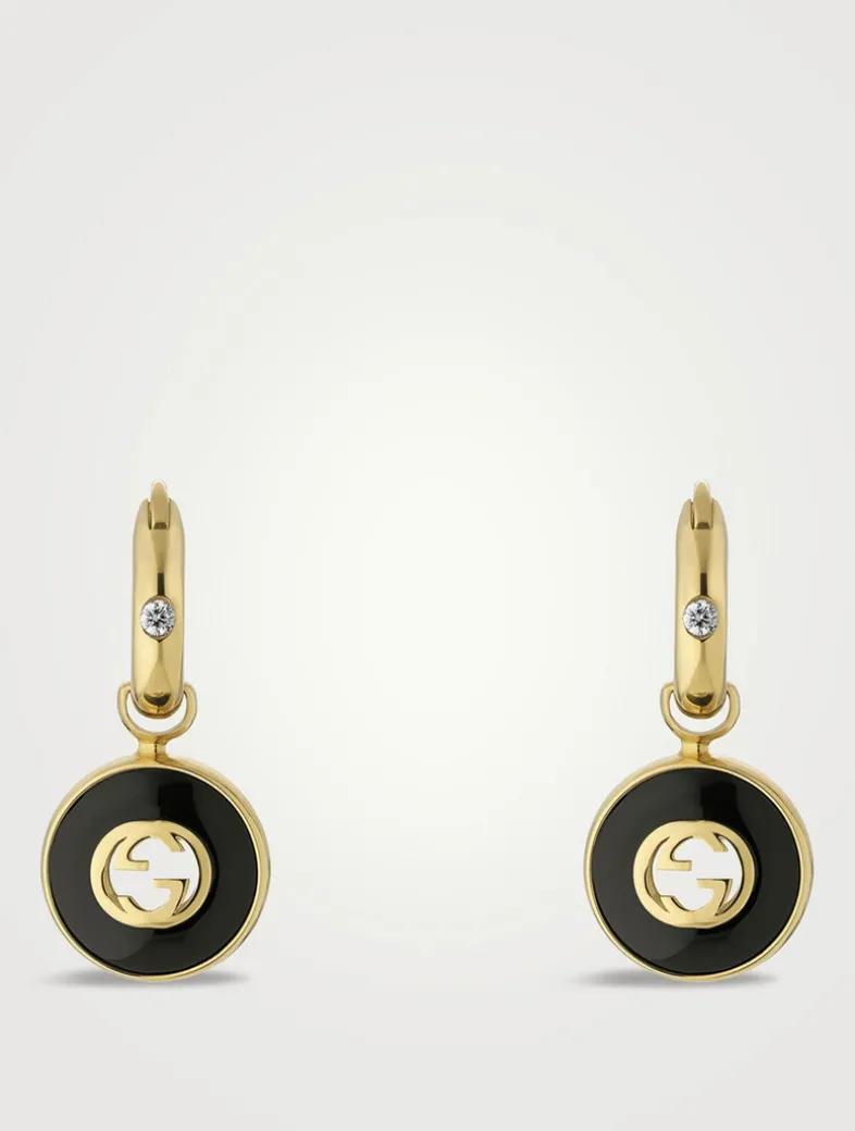 For pierced ears, this pair of hoop hinge earrings are detailed with the signature Interlocking G logo on precious black onyx stone. Finished in yellow 18k gold and two sparkling diamonds.
