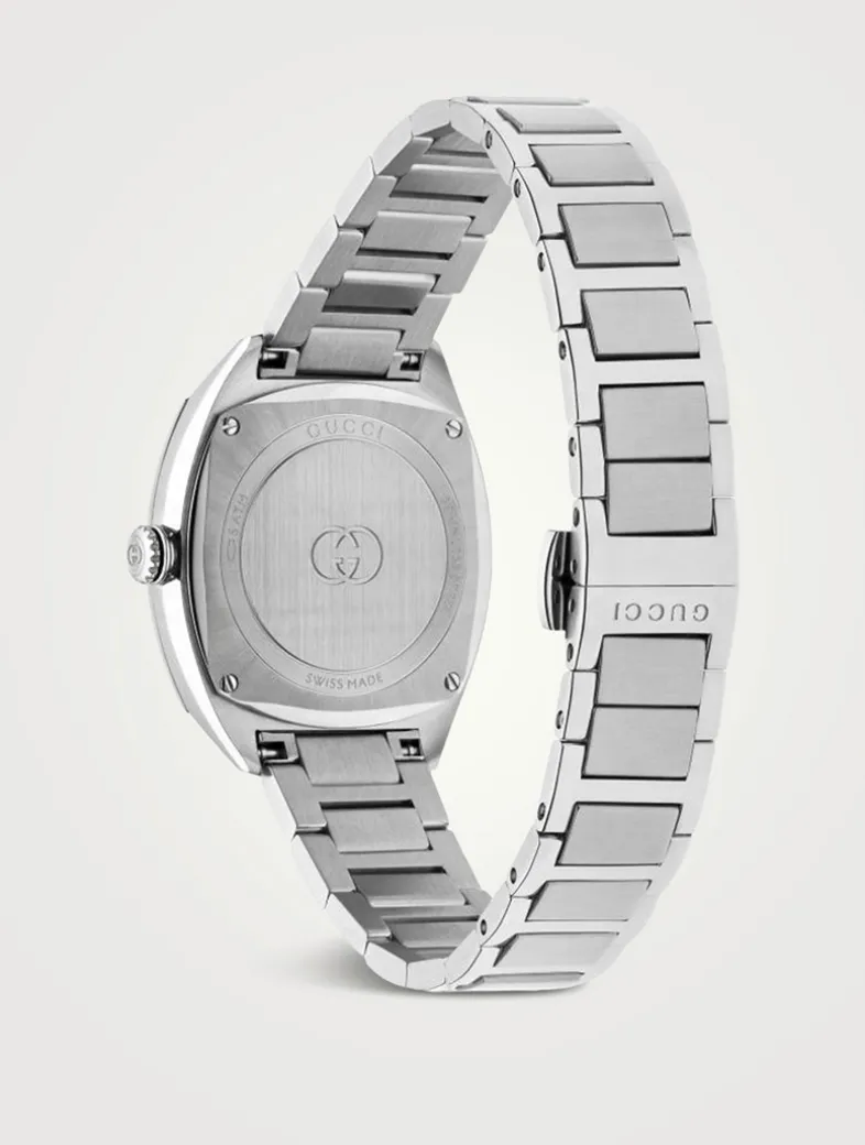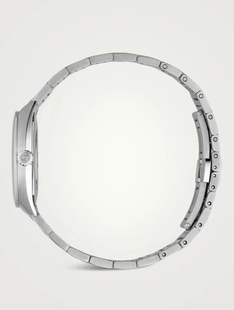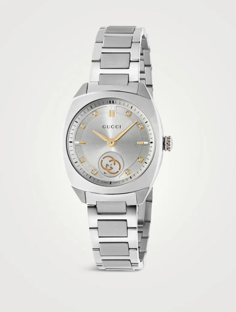 Built with a stainless steel case and bracelet, this Gucci Interlocking watch displays a brushed sunburst silver dial with eight diamonds, rose gold-plated details and an Interlocking G small seconds display.