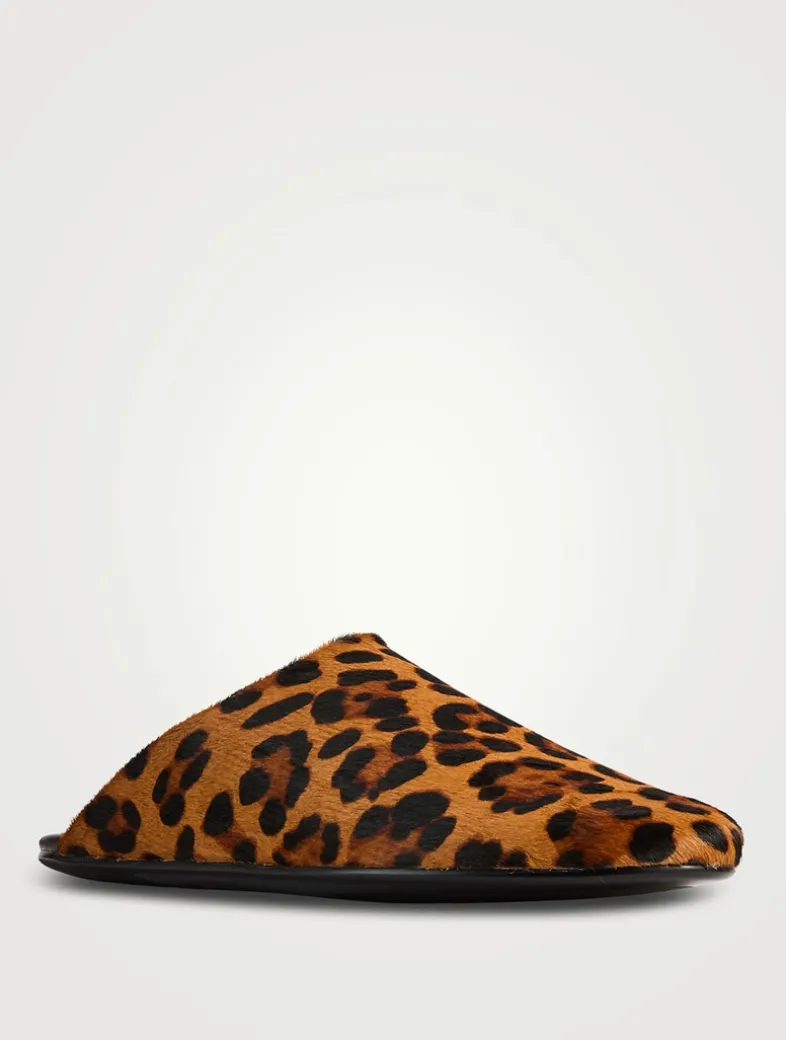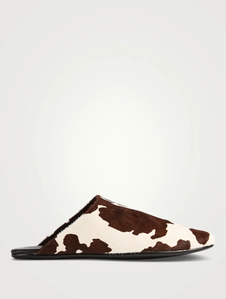 Crafted from plush calf hair, these round-toe flats are adorned with a striking animal -print motif.