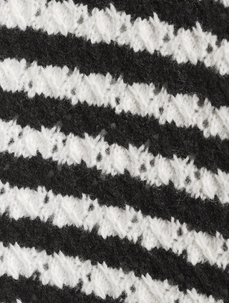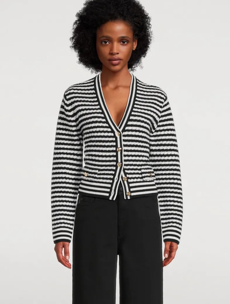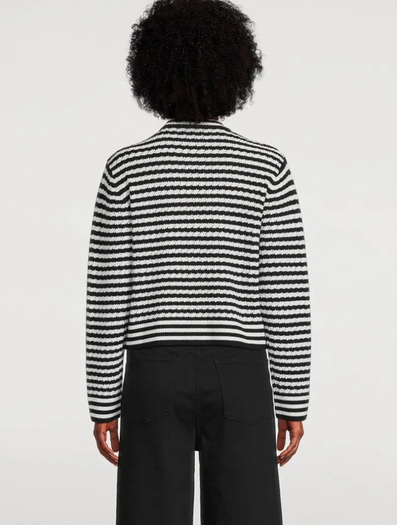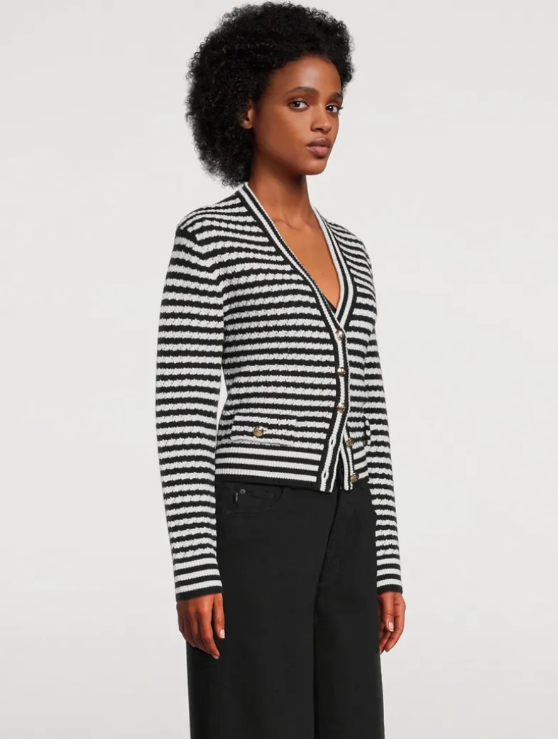 An elevated pointelle sweater crafted in a midweight, striped wool and cashmere blend. The Gwen Cardigan features a V-shaped neckline, two functional flap pockets, decorative gold-tone buttons with ANINE BING engraving at the center front, and contrast ribbed trim at the neckline, placket, cuffs, and hem. Finished with a small hand-tacked ANINE BING monogram charm. Cut for a relaxed, cropped fit.