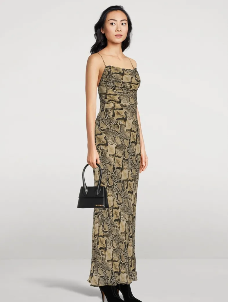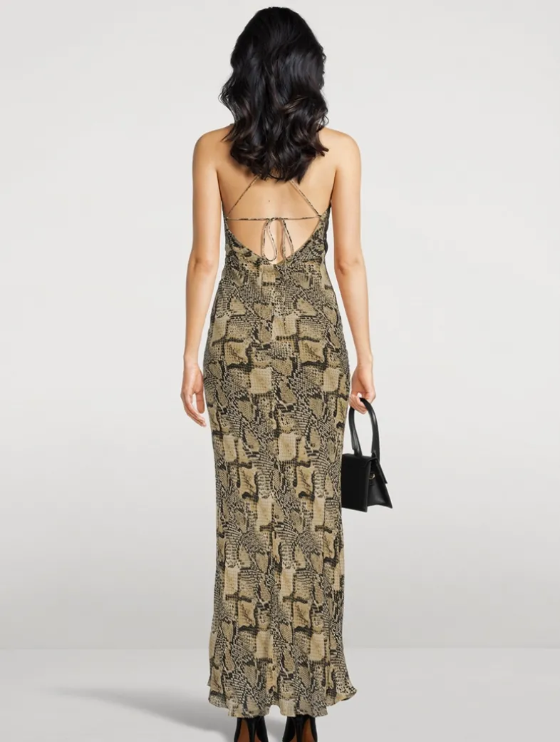 Crafted of a semi-sheer georgette fabric with a striking snakeskin print, this floor-grazing gown has a draped cowl neckline and an open back detailed with lace-up ties.