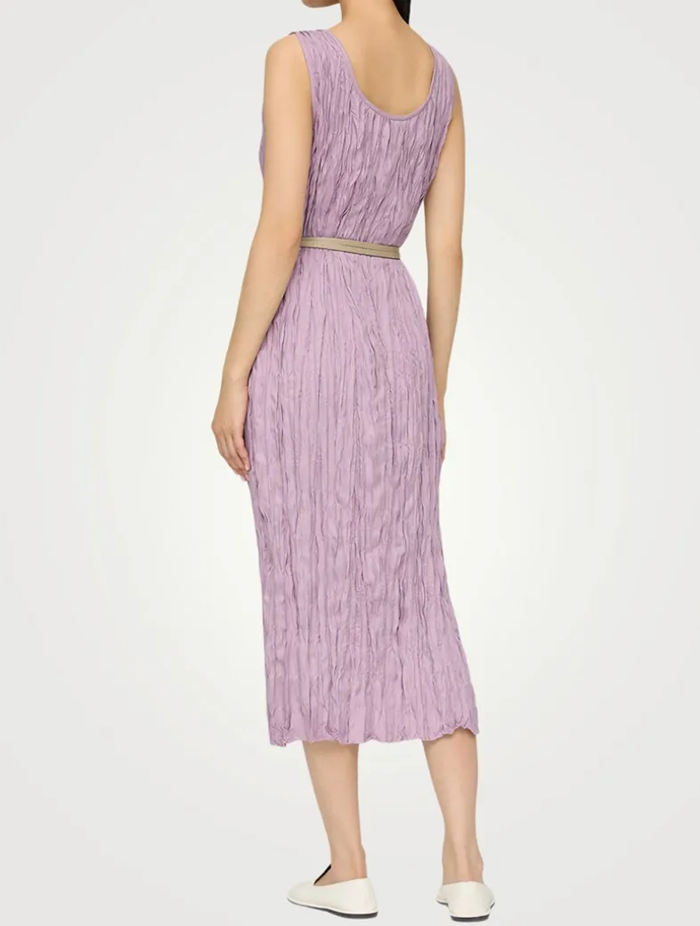 Hand-twisted plissé lends dimensional texture to this sleeveless dress, finished with a soft, brushed feel. It features a skimming, pullover silhouette with a midi length, cinched at the waist by a double-wrap leather belt.