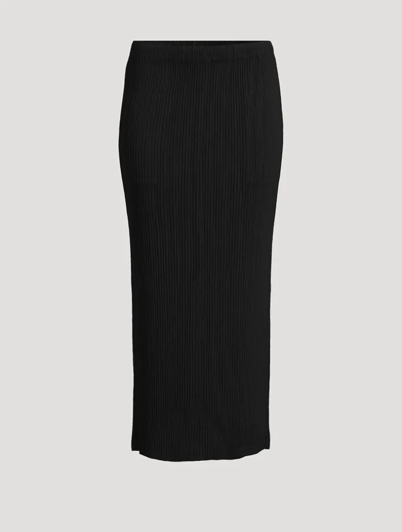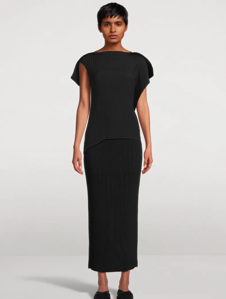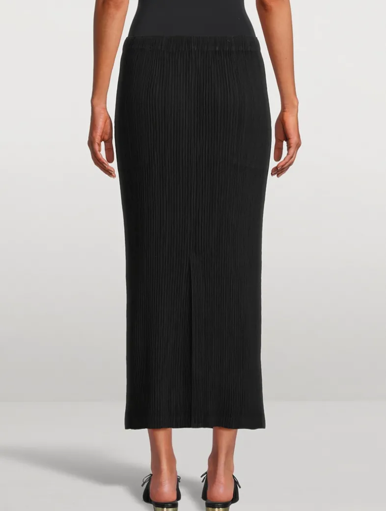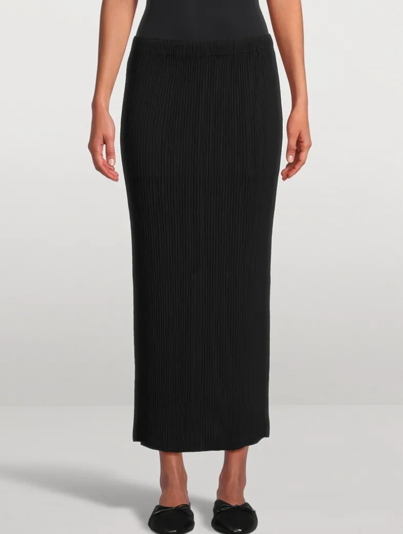 Hatching Bottoms are made from dry-touch recycled polyester fabric which is given two applications of fine pleating, creating a textured finish. This pleated maxi skirt has a high slit in the back, two side pockets, and an elasticated waistband.