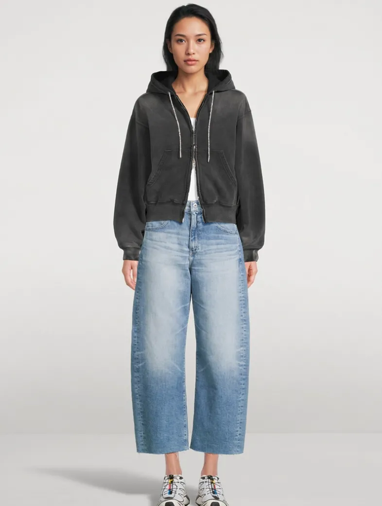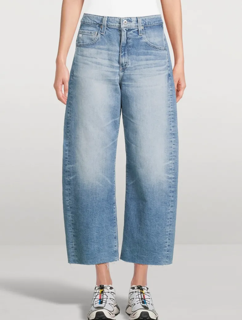The Hattie Crop is a high-rise barrel jean crafted from vintage comfort stretch denim. Finished in a light wash with raw hems, it blends a structured silhouette with a worn-in, laid-back feel.