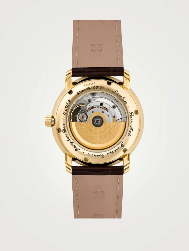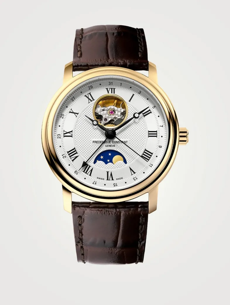 With clean lines and a classic appearance, the classics Heart Beat Moonphase is the perfect addition to any wardrobe. This timepiece features a gold-plated stainless steel case, silver dial with clous de Paris guilloché decoration, black printed Roman markers, Moonphase at 6 o’clock, an open heart beat at 12 o’clock, revealing the inner workings of the movement and a dark brown calf leather strap.