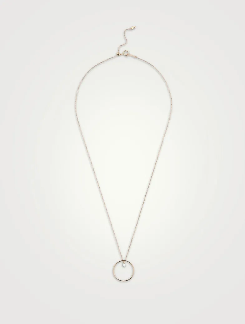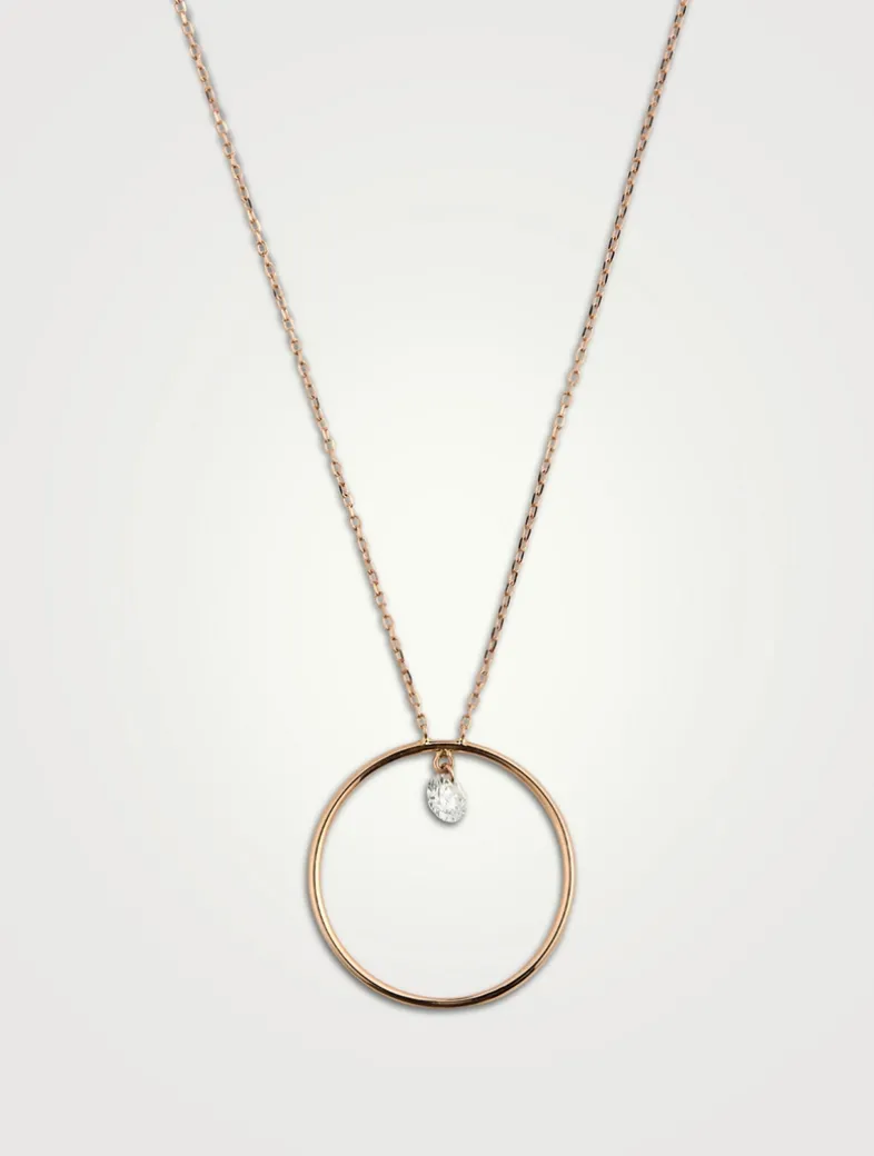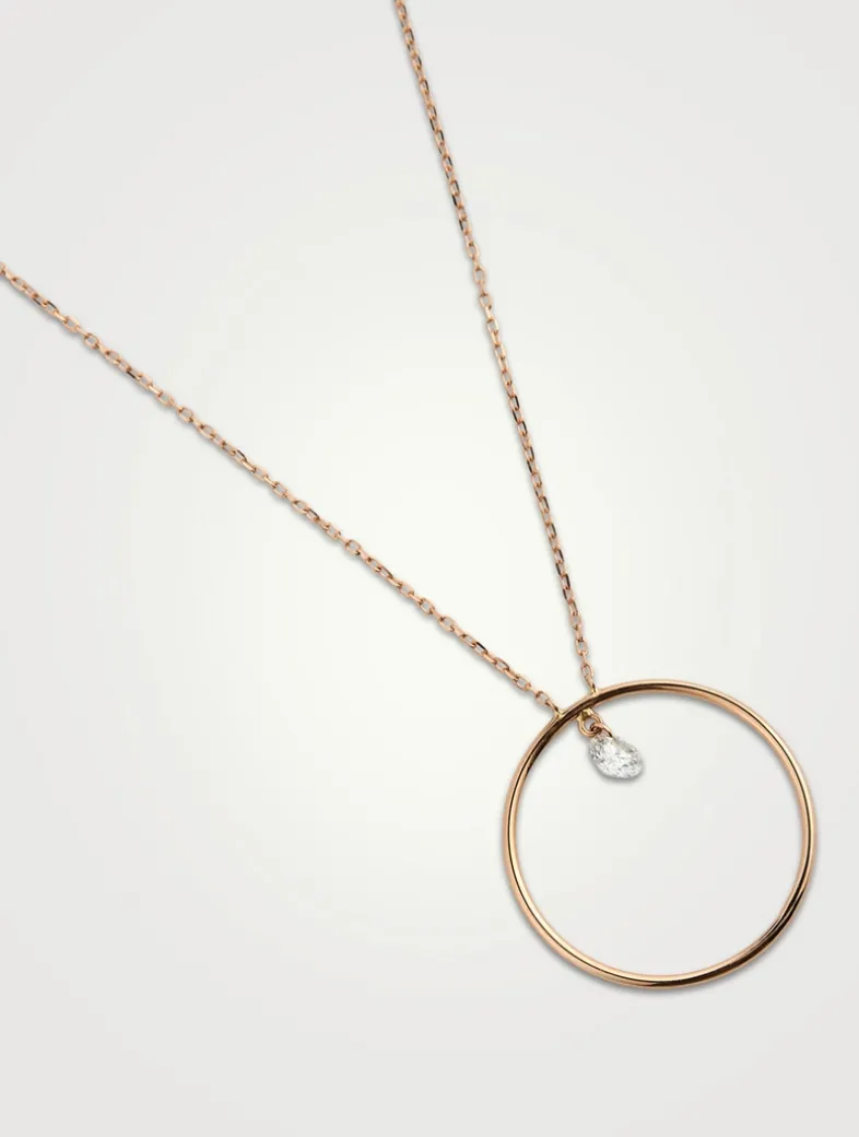 In Greek mythology, Hélios is the god and personification of the Sun. Crafted with a dainty chain, this necklace features a round pendant with a single pierced diamond in a prongless setting for 360 degree sparkle. A signature technique, the diamond is laser-drilled inserting a ring to fix it to the chain.