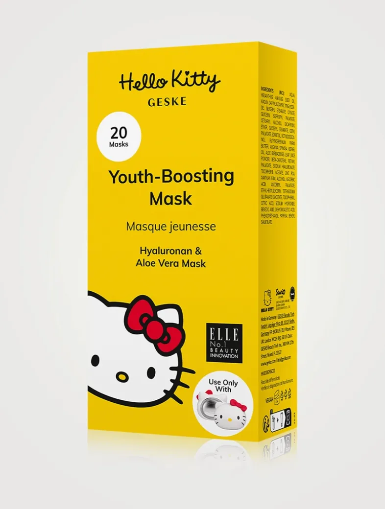 Stop aging in its tracks and unveil magically youthful skin with this sensational Youth Boosting Mask. Enriched with hydrating, anti-aging ingredients like hyaluronic acid and aloe vera, the mask in charming Hello Kitty packaging nourishes your skin from deep within and gently erases signs of age. To get the most out of your mask, download the GESKE German Beauty Tech App, where you can perform an instant Skin Scan using our proprietary AI technology, the results of which are used to generate your own personalized Skincare Routine, and browse through thousands of expert training videos for GESKE smart masks. The Youth Boosting Mask is fortified with everything you need for a glowing, fresh complexion. Try it for yourself and revel in the newfound radiance of your beautiful, youthful skin.