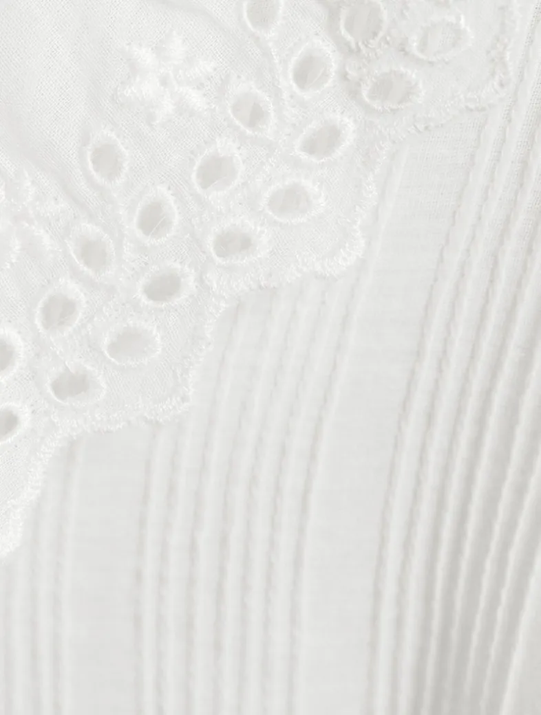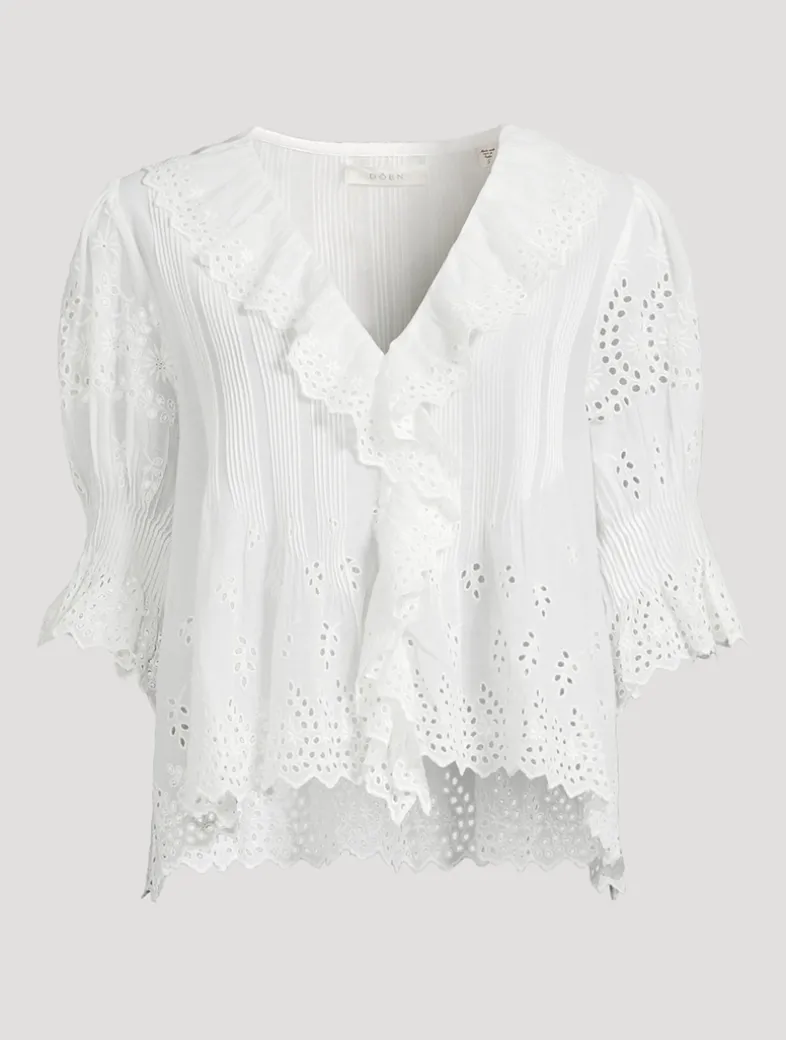 Crafted from soft organic cotton voile and detailed with eyelet, this top features a plunging V-neckline framed with cascading lace-trimmed ruffles that extend down the bodice and delicate clustered pintucks at the yoke, back, and short puffed sleeves. A line of hidden starburst buttons run up the center front.