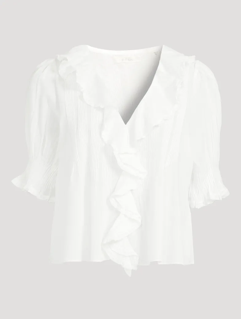 The Edwardian-inspired Henri is a brand staple you will return to again and again. In the softest organic cotton voile, it features a plunging V-neckline framed with cascading ruffles that extend down the bodice. Clustered pintucks and scattered floral embroidery lend texture, while hidden starburst buttons extend down the front. Certified to the Global Organic Textiles Standard (GOTS).