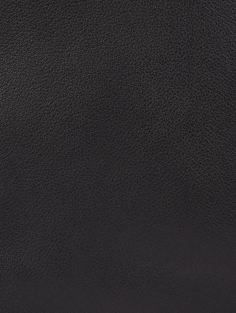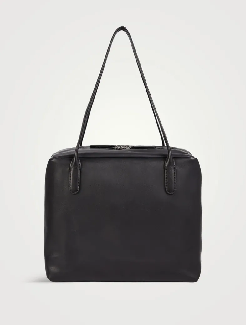 This softly structured geometric shoulder bag is crafted in smooth leather. It is designed with elongated tubular handles, a rectangular base, and a double zipper closure.