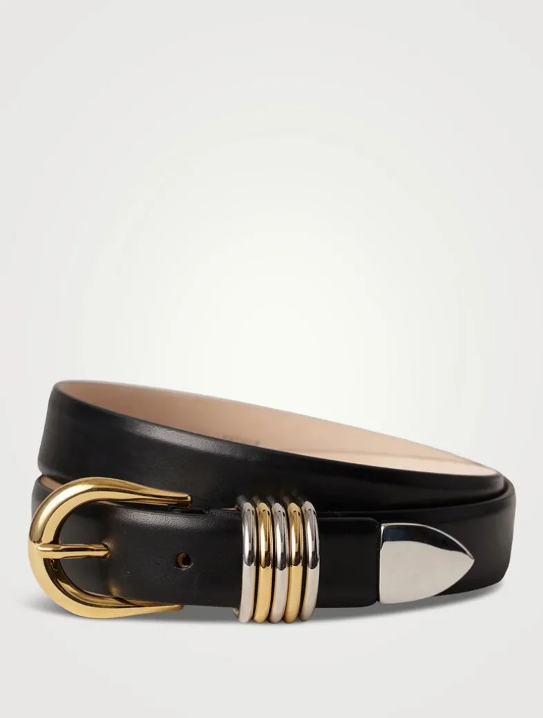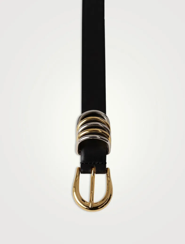 Finished with a buckle, rings and belt-tip in mixed metals, this three-ring belt is handcrafted in Italy from smooth, luxe calfskin leather and a signature beige suede lining. Cut to a one-inch height that is compatible with most belt loops, the 10-hole design accommodates fluctuation in size for timeless wear. The leather is sourced from Italy and certified by the Leather Working Group (LWG).