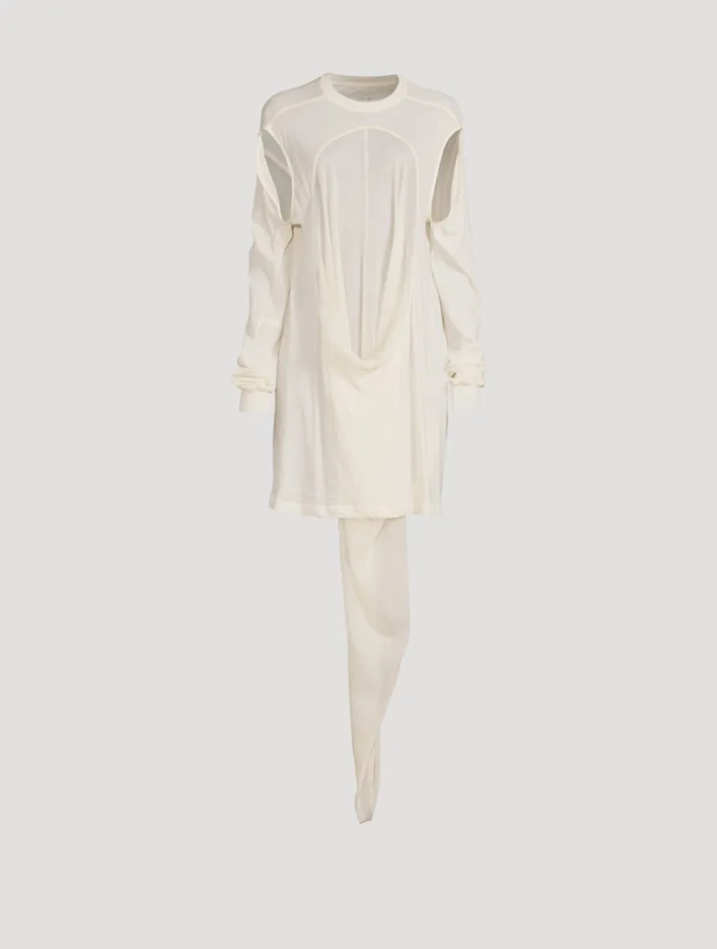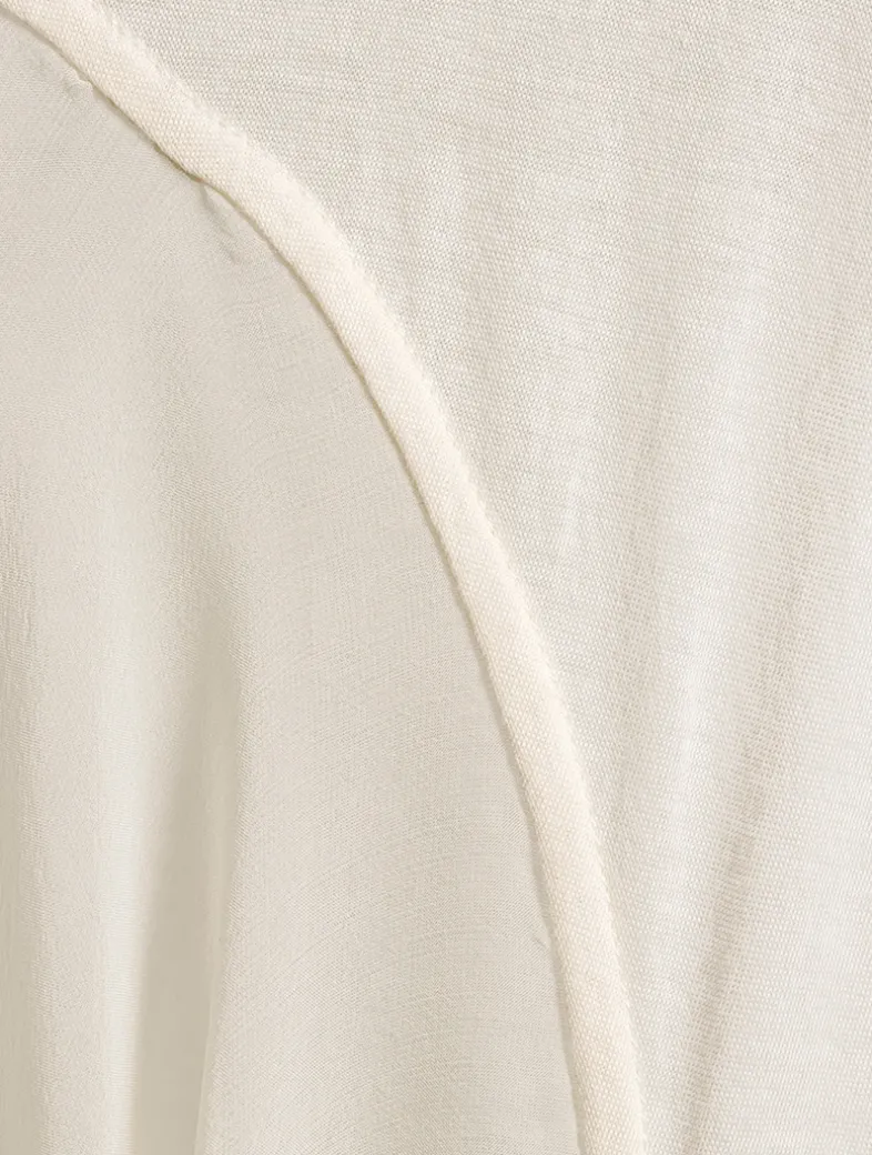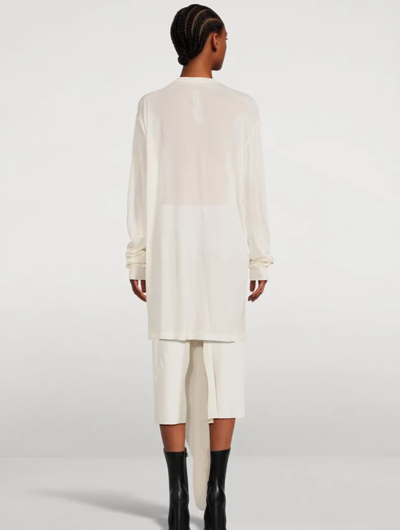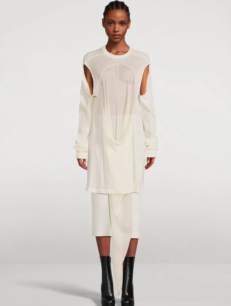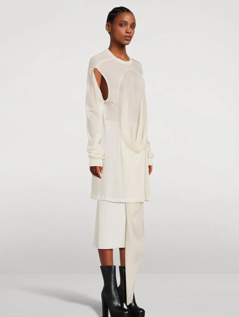 This Drain tee has a ribbed neckline and long cape sleeves with openings at the front armhole, so the arms can be worn in or out. It features a large round seam on the center front body with a panel that drapes downwards inside like a drain, and falls out below the hem, finishing at ankle length. Made in a combination of cotton and silk chiffon, this lightweight jersey is semi-transparent with a soft handfeel. The jersey is made using GOTS certified organic cotton.