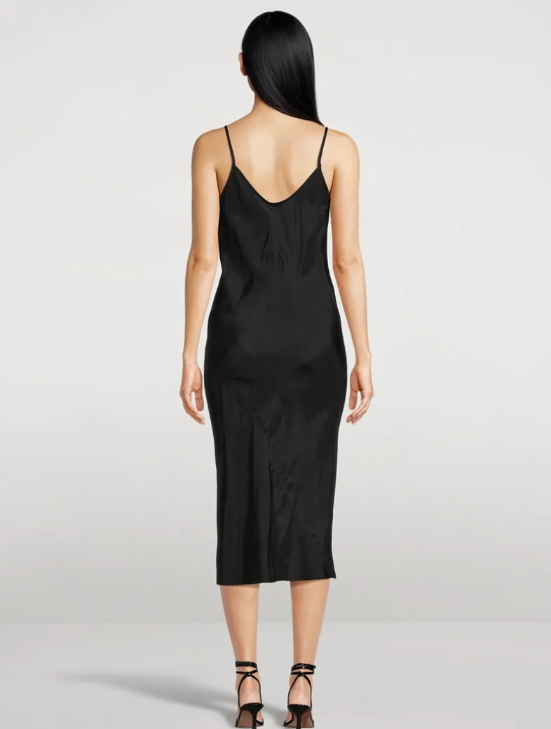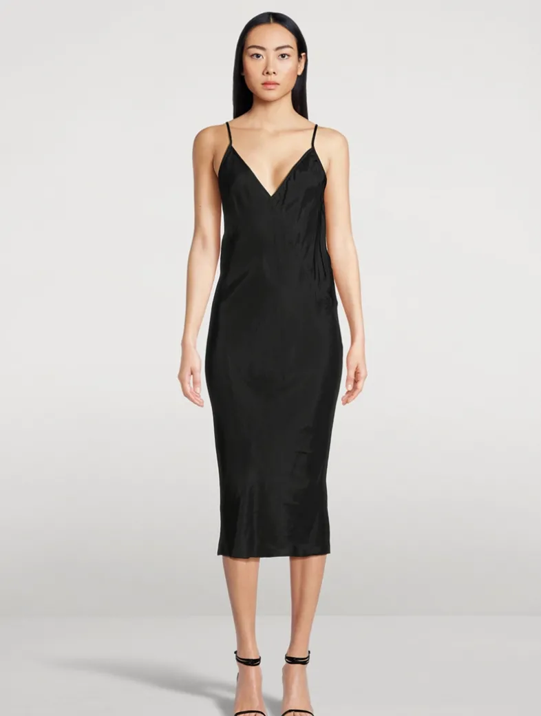This slip dress has a V-neck, spaghetti straps, and a scoop back. It features bias seams that wrap the body and create a slight pleat detail at back. This lightweight japonette is fluid with a cool handfeel. This fabric is made using cupro which is biodegradable and 100% plant based.