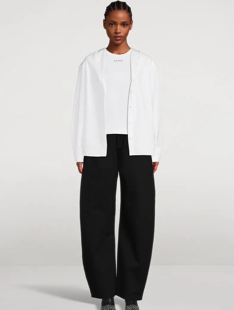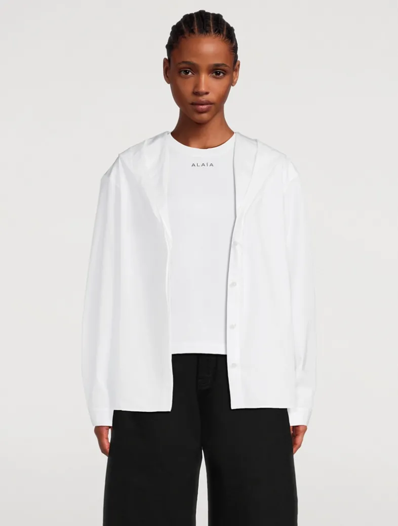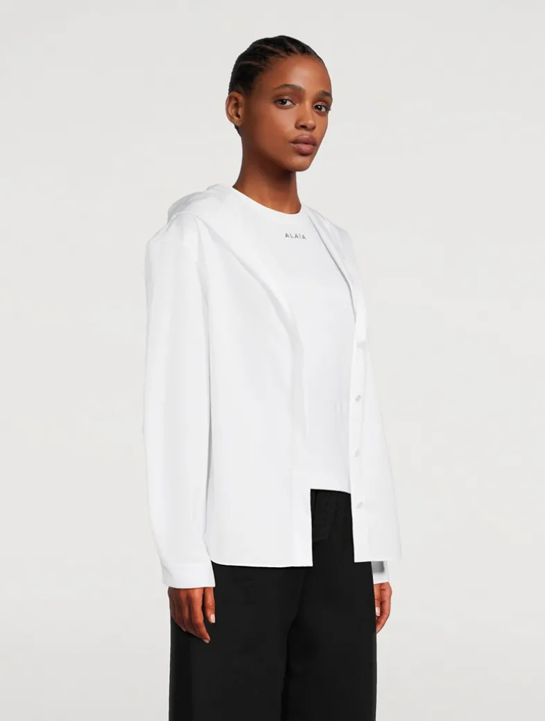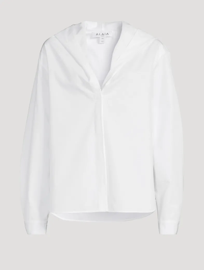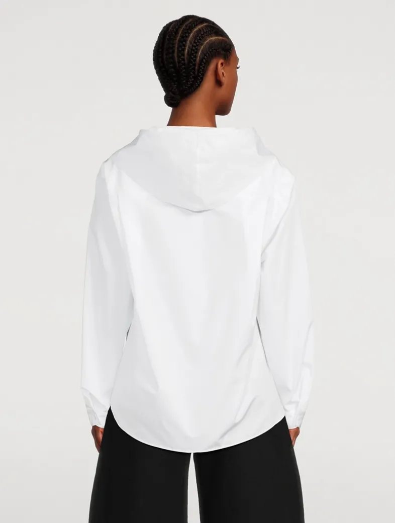 This long-sleeve top is crafted of a crisp cotton poplin and cut in a billowing silhouette with a plunging neckline and attached hood. The cowl hood drapes over the shoulders like a shawl collar. A concealed button placket and buttons cuffs complete the look.