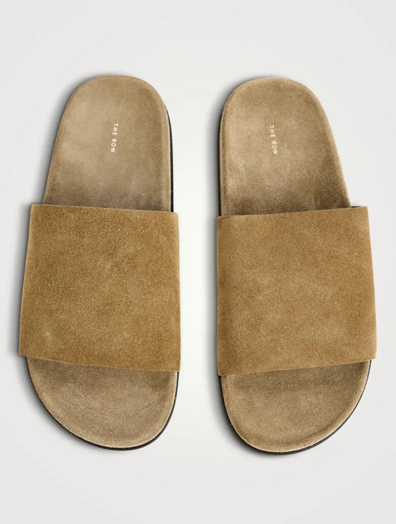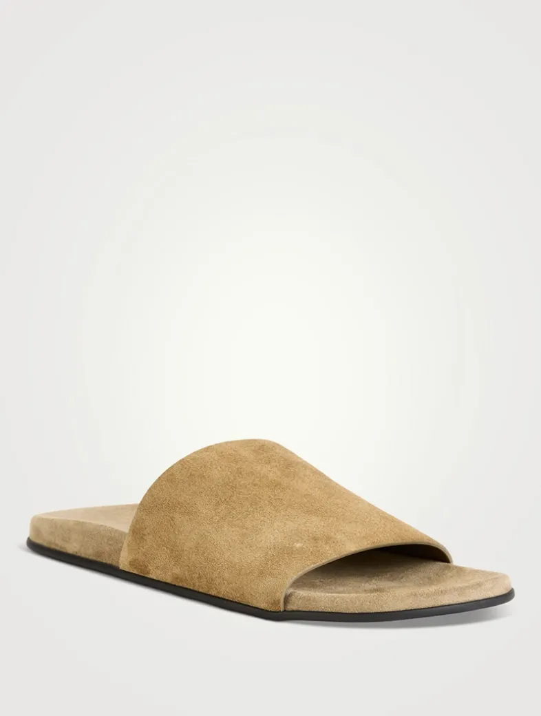 These flat slip-on sandals are made in Italy from soft calfskin suede with a contoured footbed and a rubber sole.