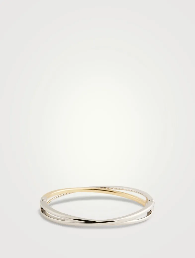This twisting Hyperbola bangle is crafted with unmistakable Swarovski savoir-faire. The two overlapping bands are presented in a mix of gold-tone and rhodium plating, with round Swarovski Zirconia placed in a prong setting.