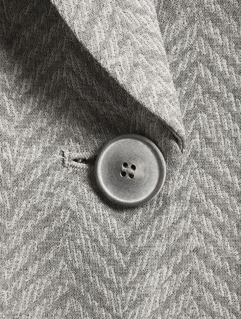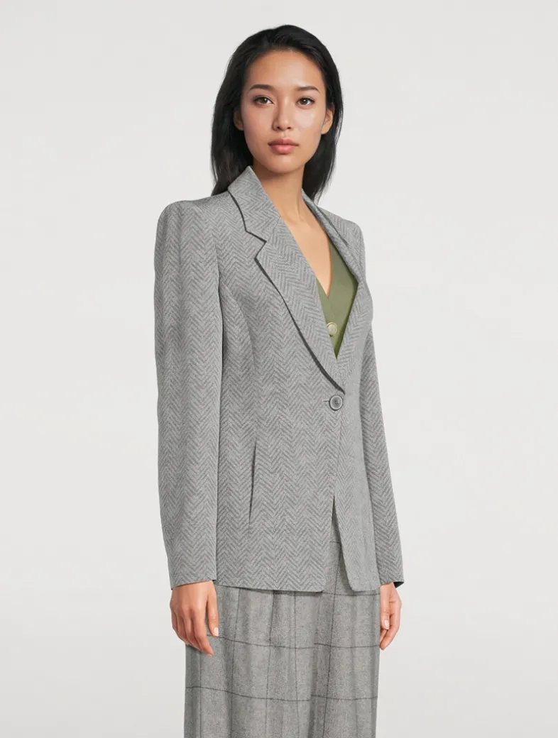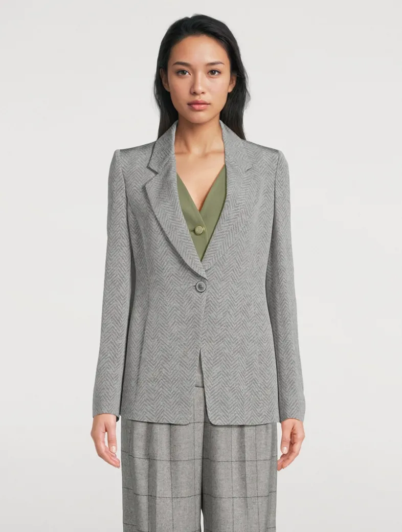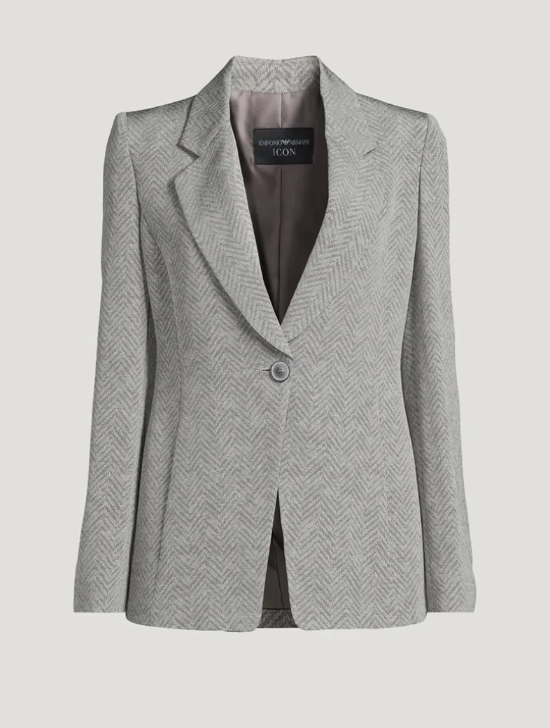 This single-breasted blazer, made of a wool and viscose blend, is distinguished by a classic chevron motif. The garment is part of the Icon capsule collection.
