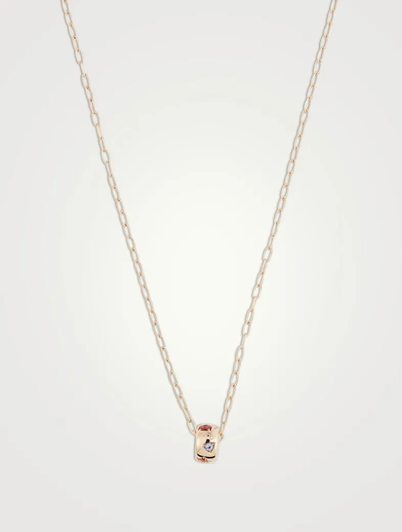 Exhibiting half a century of savoir-faire, the Iconica collection honours POMELLATO’s fine goldsmithing skills and Milanese roots. Set on an open link chain, this necklace features a polished ring pendant set with multicolour stones.