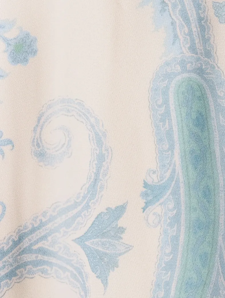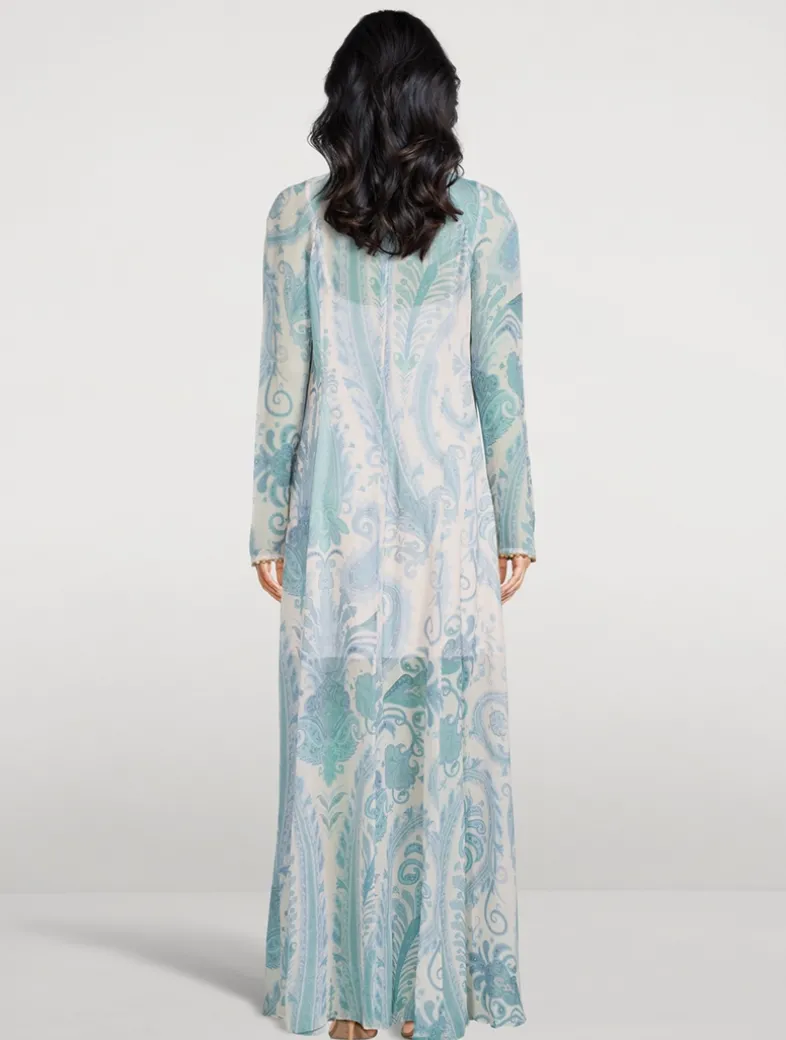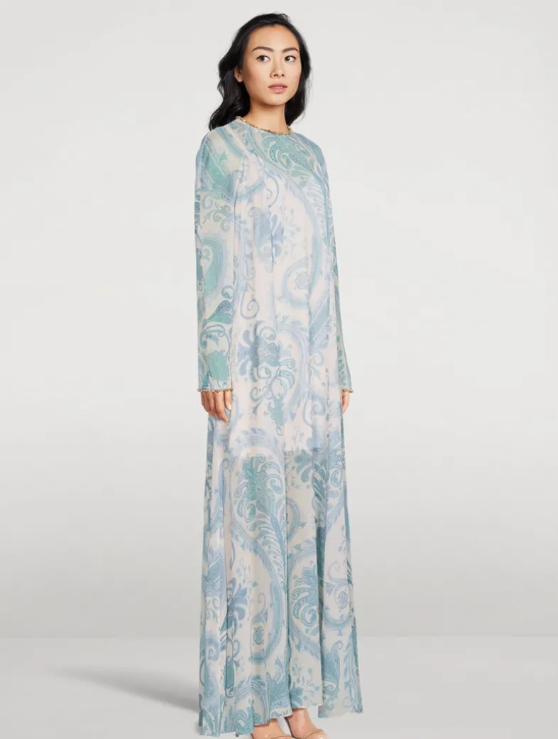 A maxi-length dress featuring a beaded neckline and cuffs, finished with a centre back zip closure. Crafted from a light-as-air fabric with a classic paisley print. Comes with a separate slip.