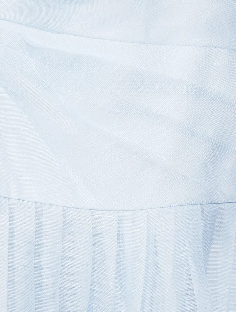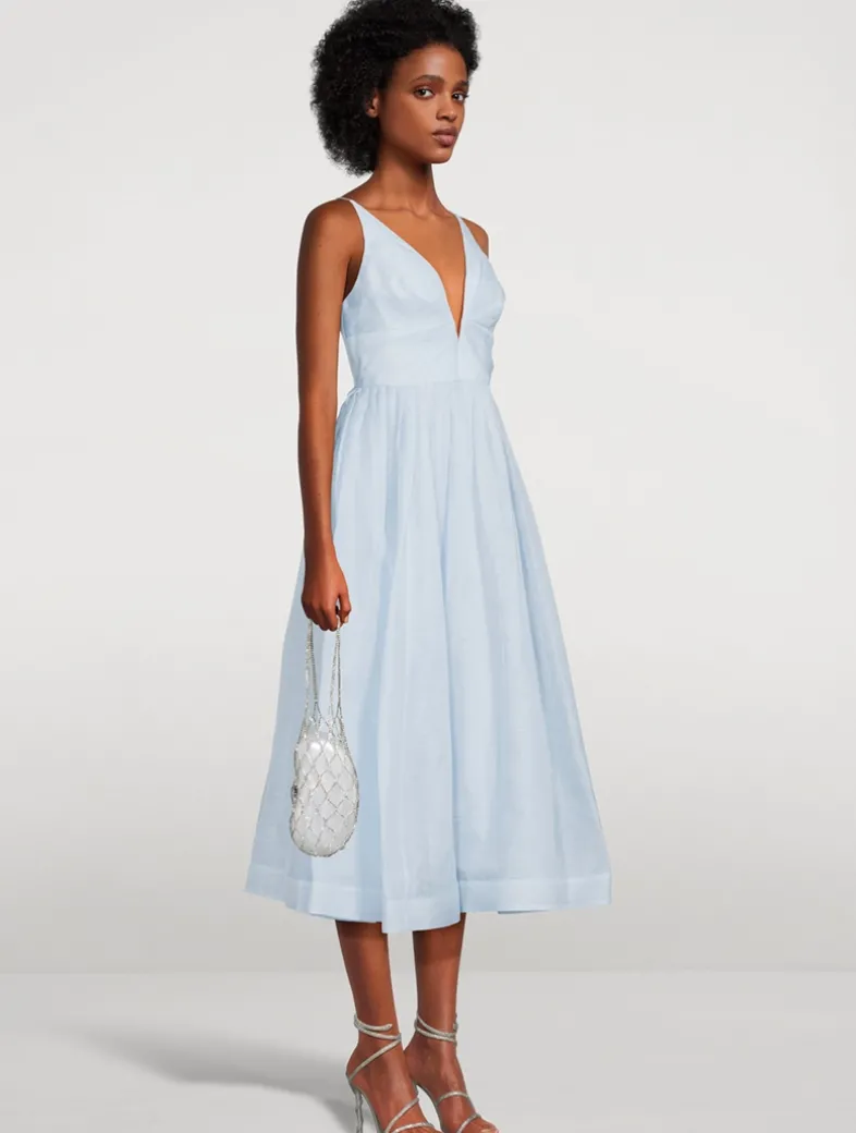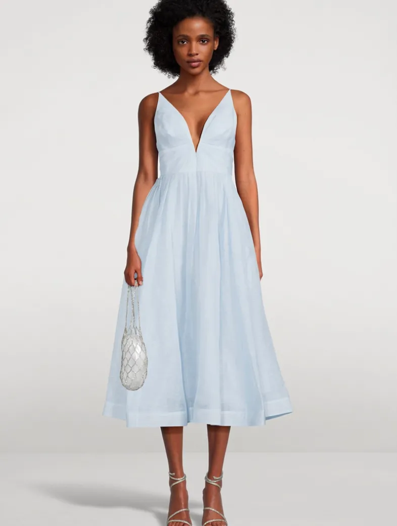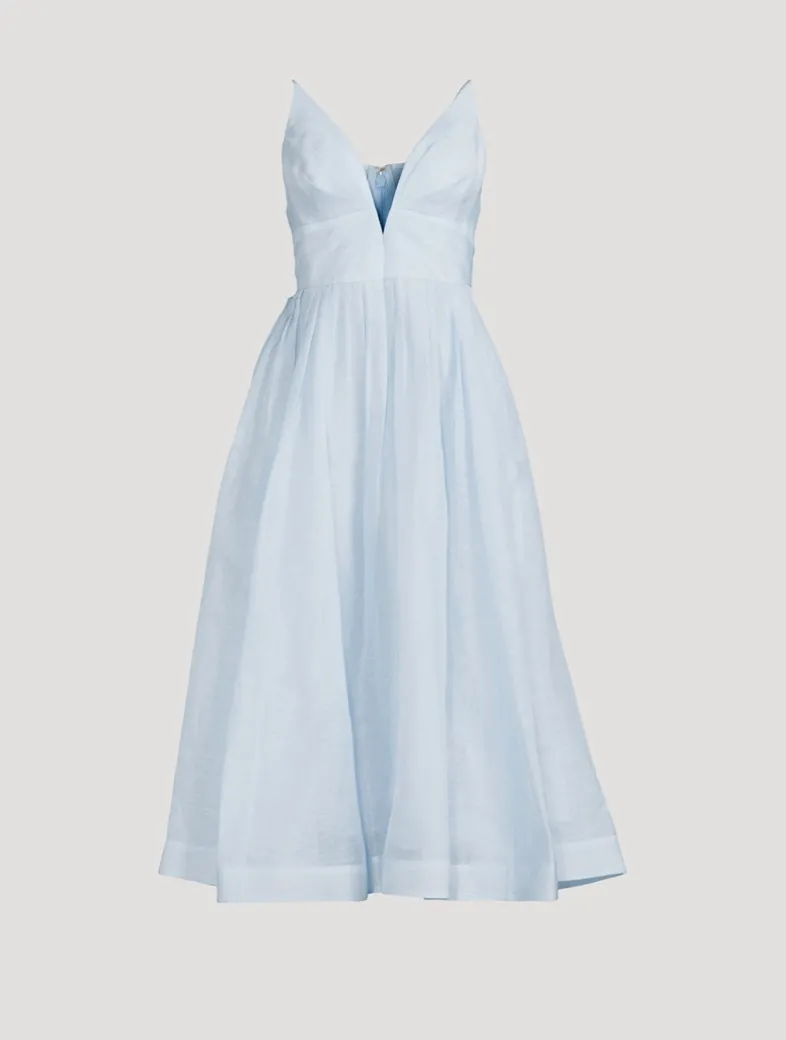 A linen and silk-lend midi dress featuring a fitted bodice, a plunging V-neckline, and a gathered-waist skirt. It has V-wire at centre bust with boning along the side seams and adjustable spaghetti straps.
