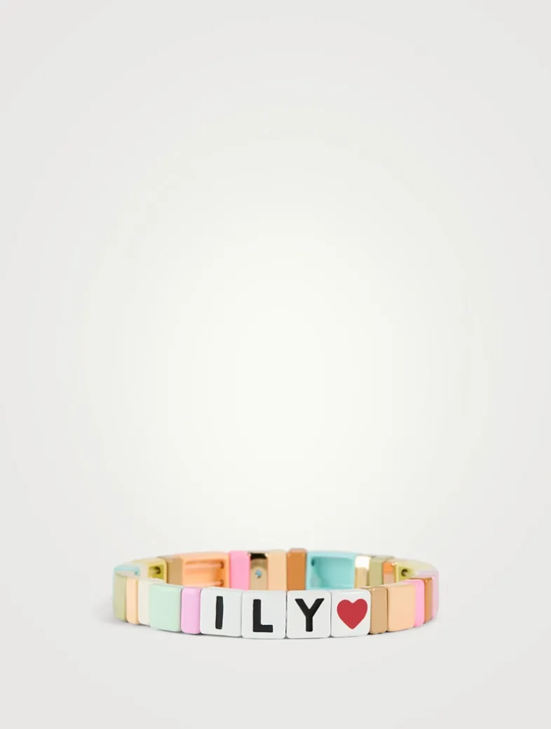 Strung with colourful geometric beads of varying sizes, this stretch bracelet features beads that spell out ILY. Only available at Holts.