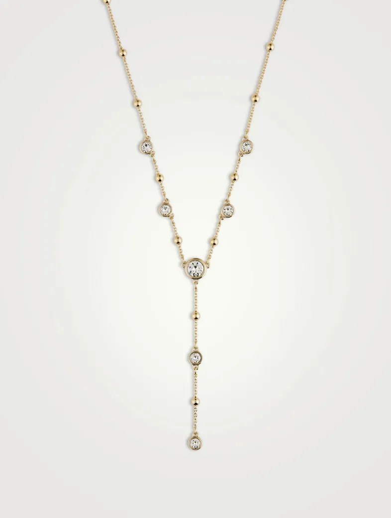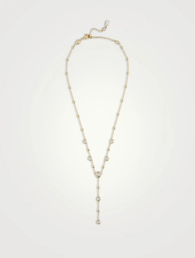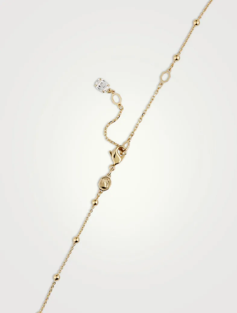 This design features a gold-tone plated chain, accented with an array of shiny metal droplets and dazzling round-cut crystals in a puffy bezel setting. A delicate strand drops elegantly in the middle, while a single Swarovski Zirconia is placed in the elongation for added luxury.