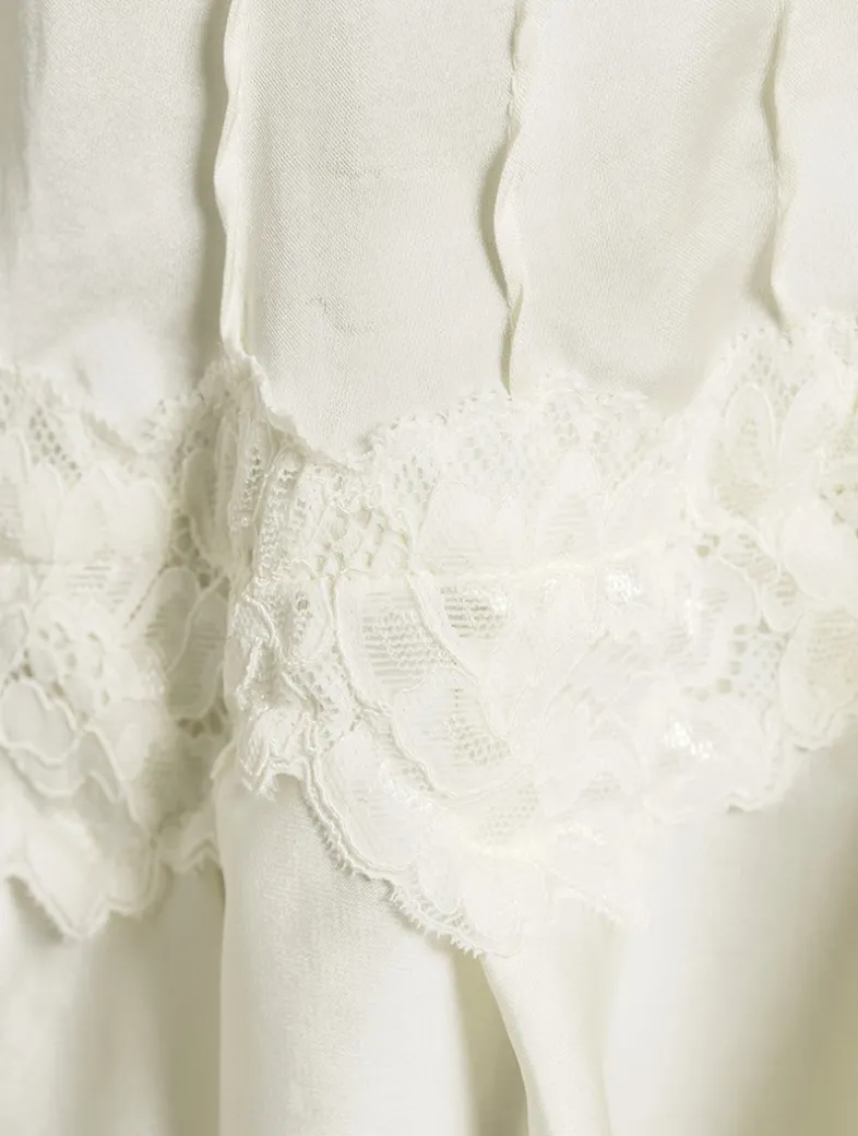 Romance awaits with this floaty slip, featured in a silky, tiered design with delicate lace trim. It is cut to a fluttering silhouette with a plunging neckline and mini-length hem.