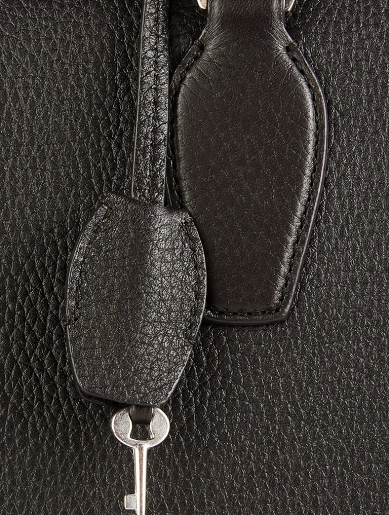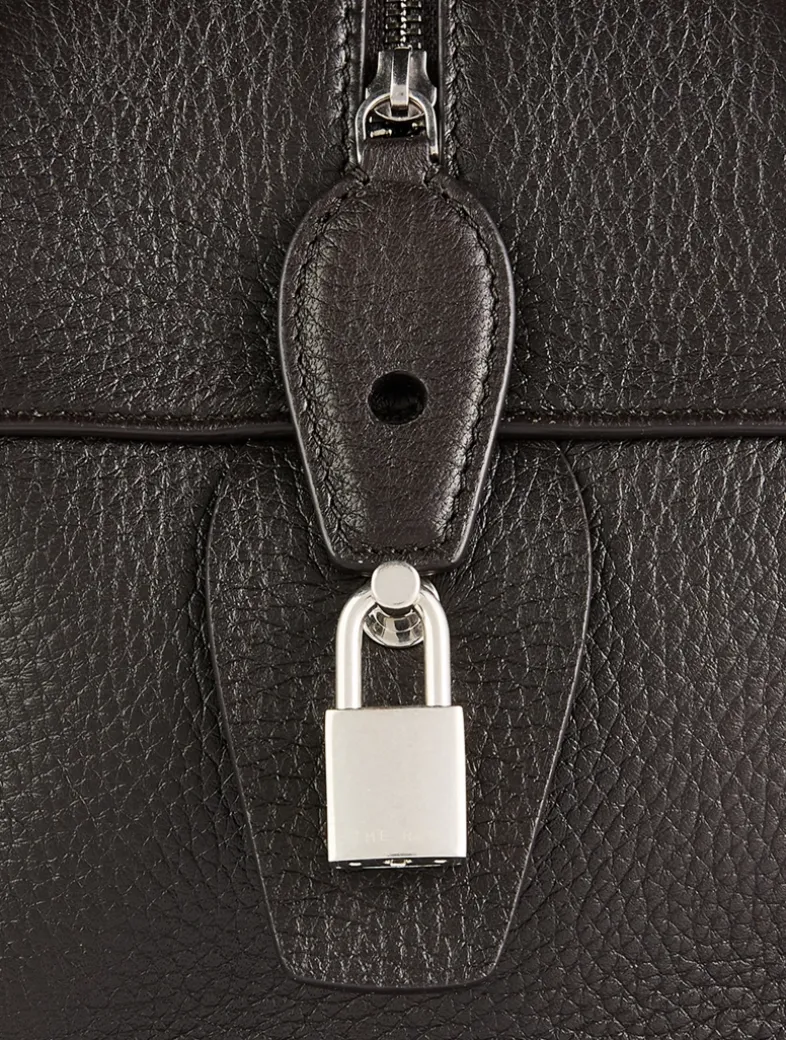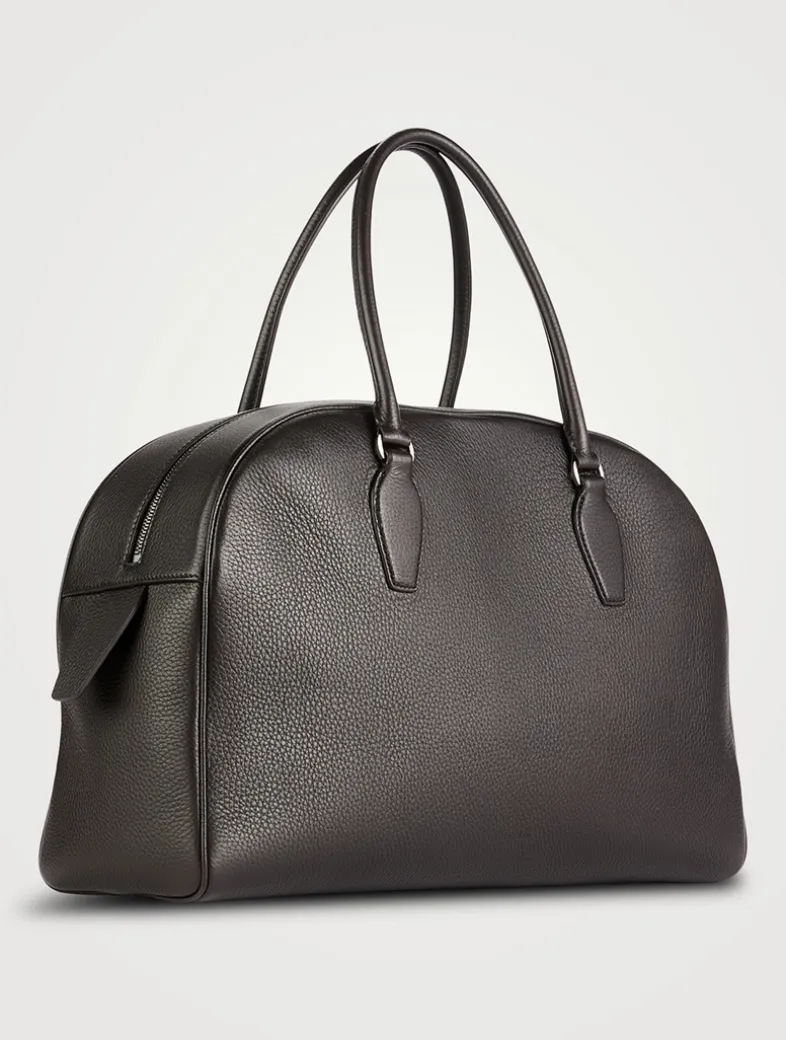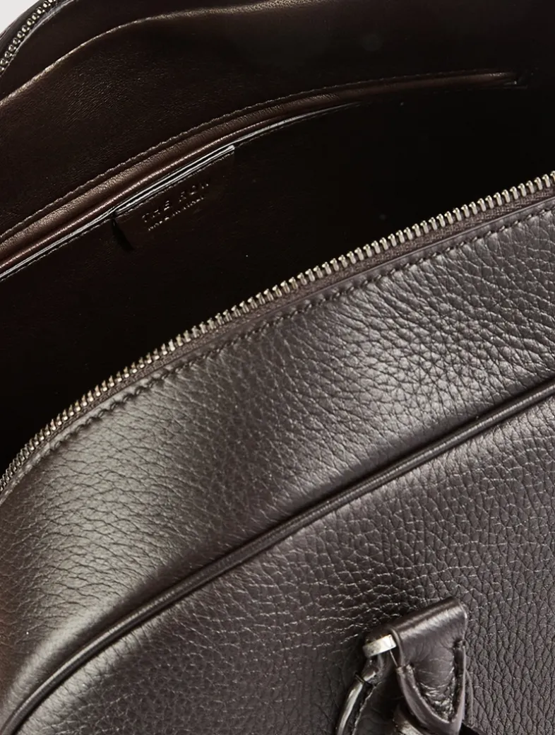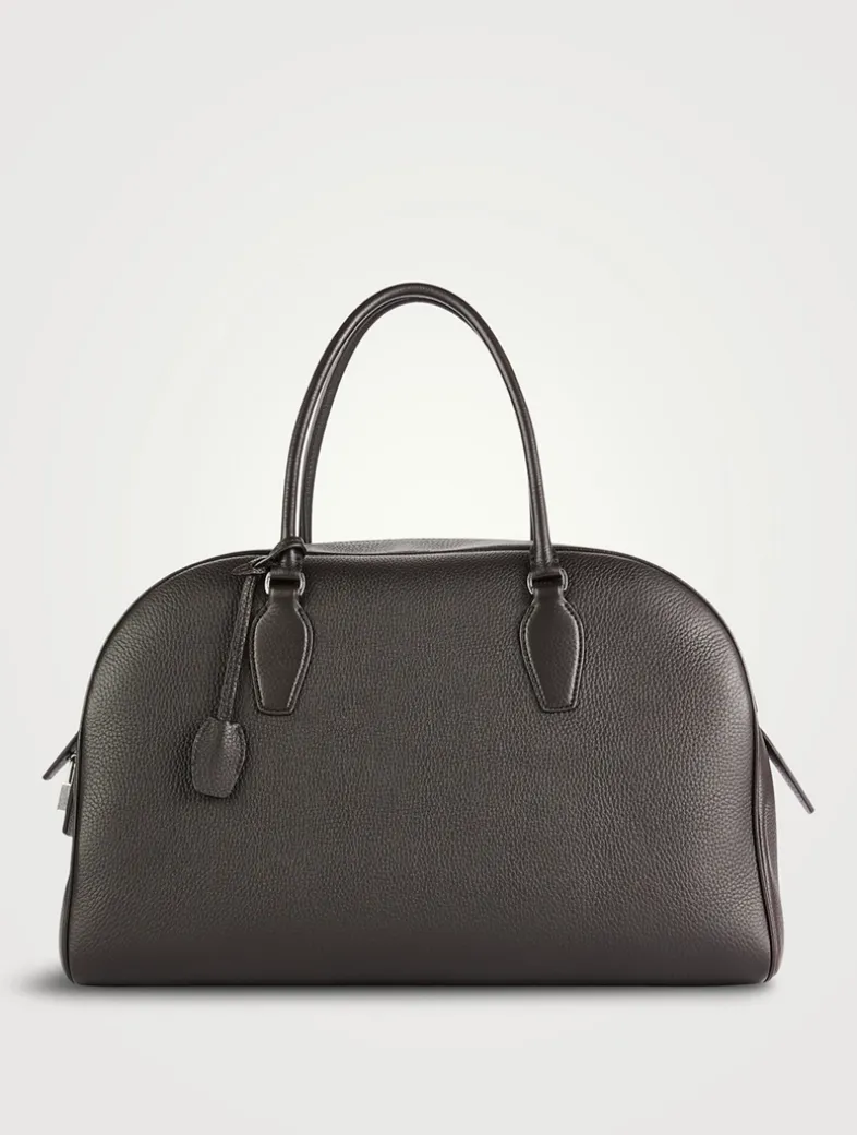 Updated bowling bag in grained leather with tubular handles, branded metal padlock and key, and a zipper closure. It has one interior zipped pocket and one slot pocket to keep your essentials secure.
