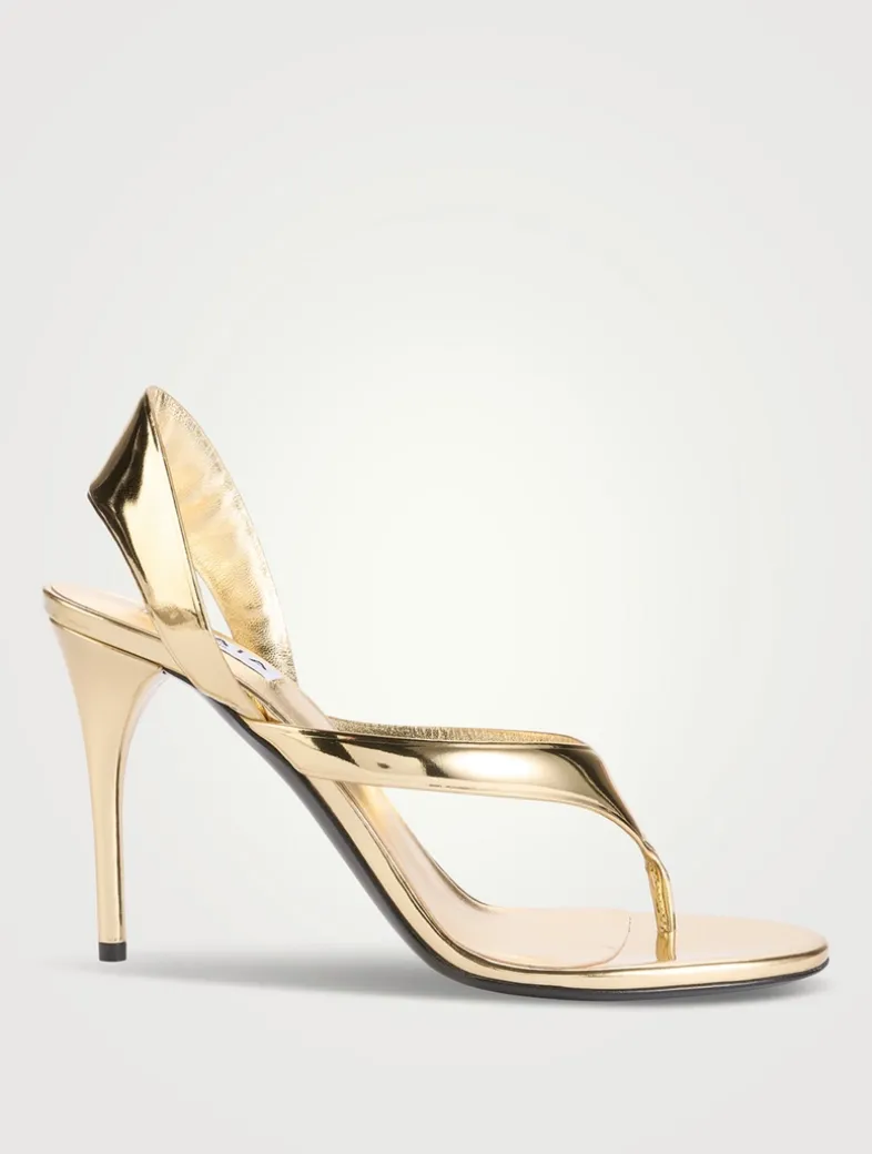 Set on a high heel, these sandals are designed with a wide slingback strap and a thong toe. They are crafted of smooth leather with a glossy metallic finish.