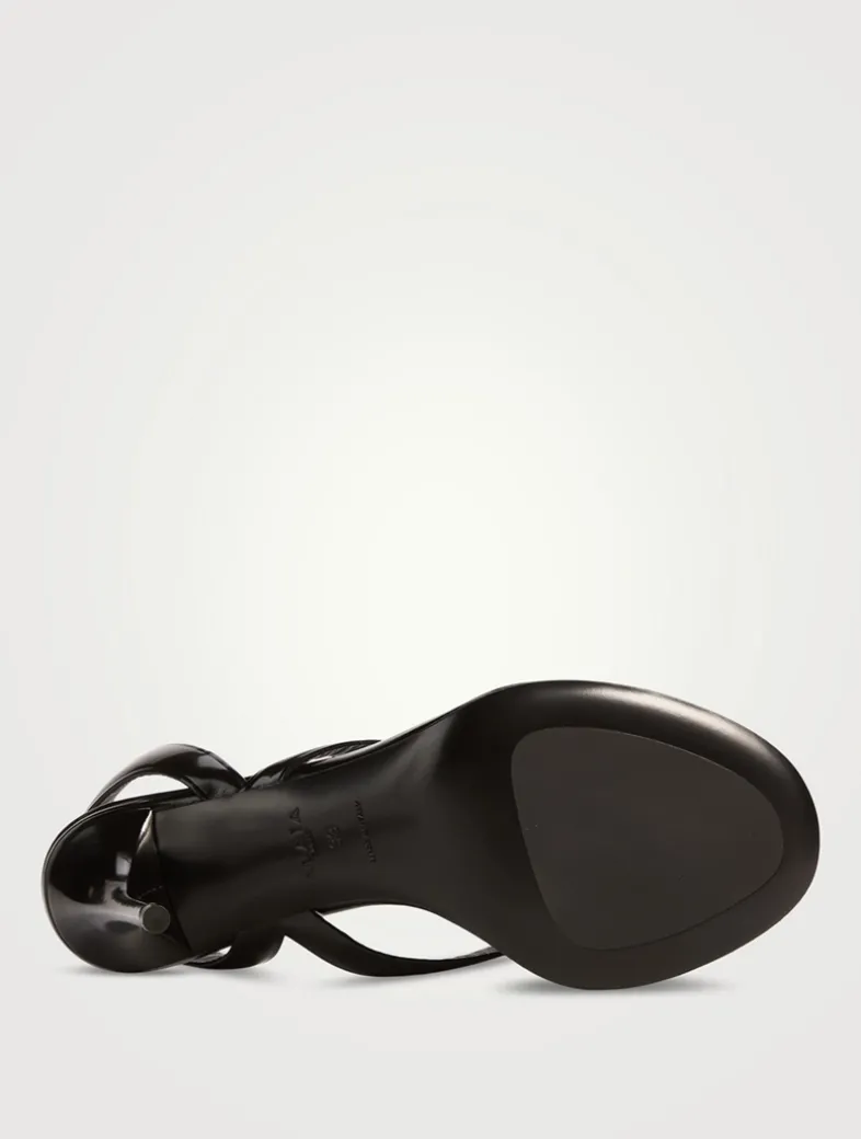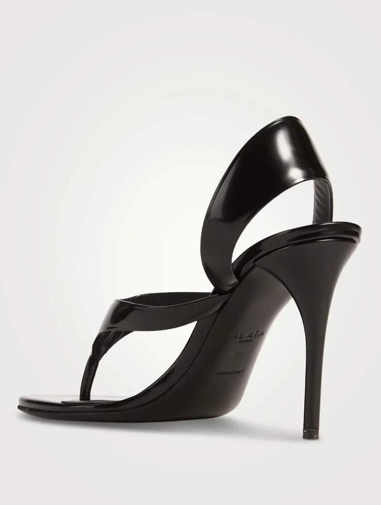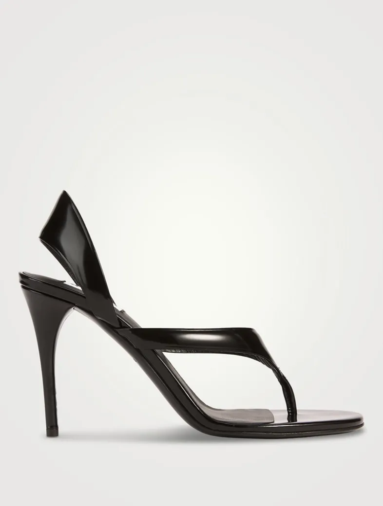 Set on a high heel, these sandals are designed with a wide slingback strap and a thong toe. They are crafted of smooth leather with a glossy patent finish.