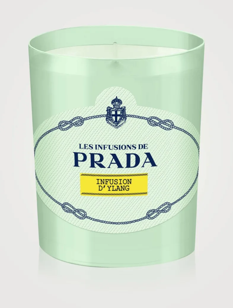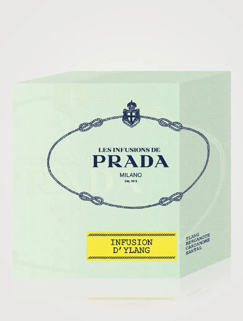 Infusion d’Ylang candle encapsulates all the Prada codes within an elegant Prada green opaline glass signed by a Saffiano embossed label in the shape of the historical logo. This luxurious object brings home the sophisticated spirit of Prada.