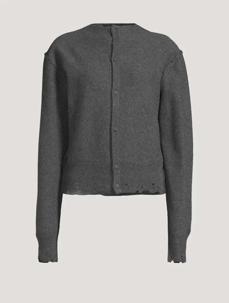 A faux inside-out design lends a playful touch to this cardi. Knit from a mix of cashmere and wool, it has textured seaming at the shoulders and distressed detailing at the cuffs and hem.