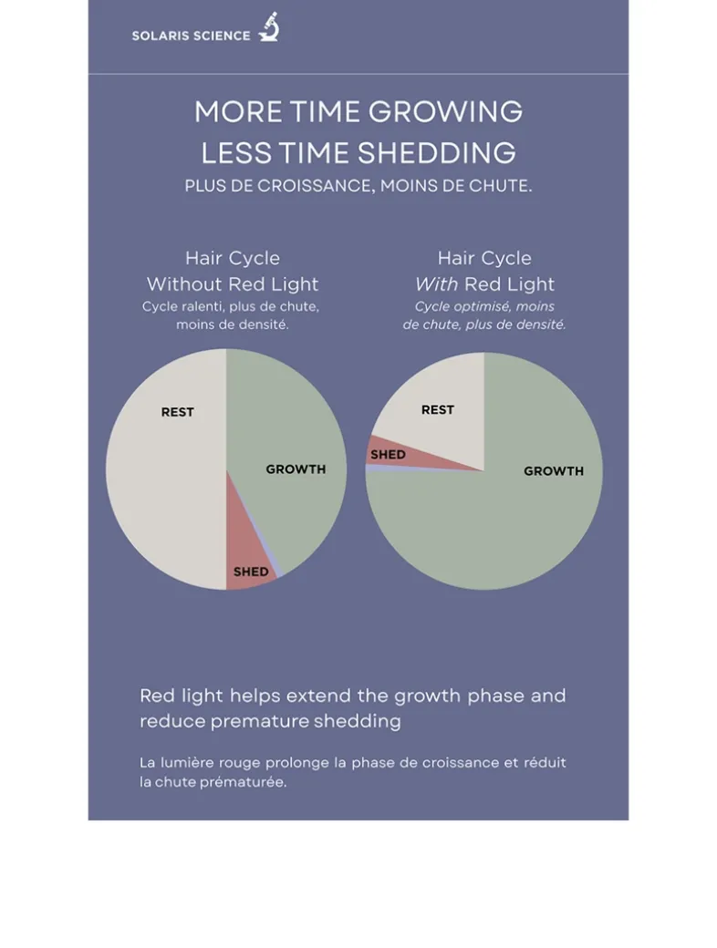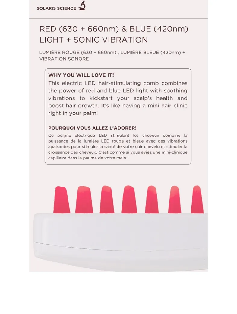 This innovative tool does more than detangle—it revitalizes your scalp. Imagine a calming scalp massage combined with the therapeutic benefits of clinically proven red and blue LED lights at wavelengths of 620 +/- 10 nm and 420 +/- 10 nm. The red light specifically aids in stimulating hair follicles for growth, increasing density, and strengthening each strand to reduce shedding and breakage.
