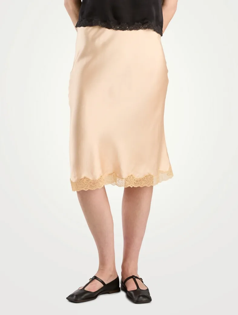 Nodding to boudoir-inspired styles, this mid-length slip skirt in silk charmeuse is embellished with tonal lace trim and topped with an elasticated waistband.