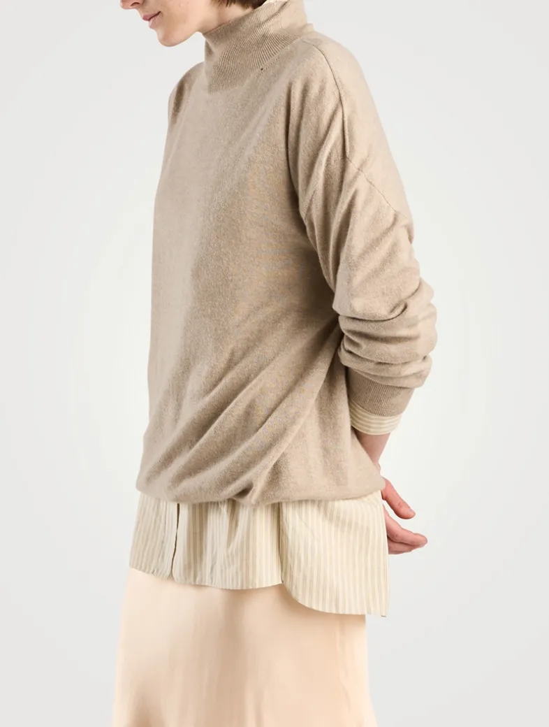 This oversized turtleneck sweater is knit in ultrafine cashmere yarns with a seamless construction and finely ribbed neckline, cuffs, and hem.