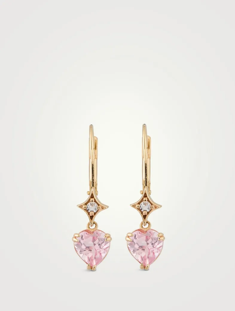 Pink morganite heart gemstones dangle from French clips set with a clear topaz encrusted gothic star.